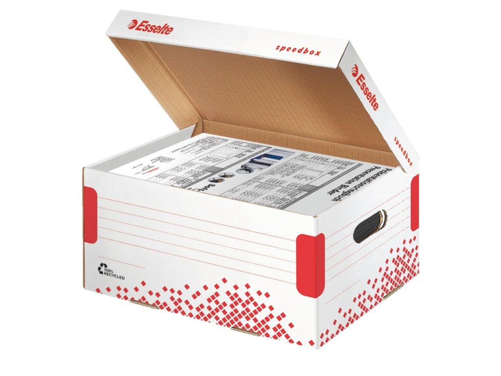 Archívne krabice so sklápacím vekom z archivačného systému Speedbox. Spevnené steny aj dno pre maximálnu pevnosť a odolnosť pri stohovaní. Ideálne na prenos dokumentov alebo rôznych predmetov. Vyrobené zo 100% recyklovanej vlnitej lepenky. Farba biela/ červená. Rozmery 355 × 193 × 252 mm. Väčšie balenie 15 kusov.Dodatočné parametre