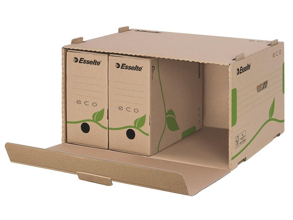 Krabica z archivačného systému Esselte ECO navrhnutá so zeleným prístupom. 100% recyklovateľná s 85% podielom spotrebiteľského odpadu, certifikovaná FSC. Veľkosť optimalizovaná iba na papiere A4 s cieľom minimalizovať odpad pri výrobe.Rozmery (š x v x h): 340 x 259 x 439 mm