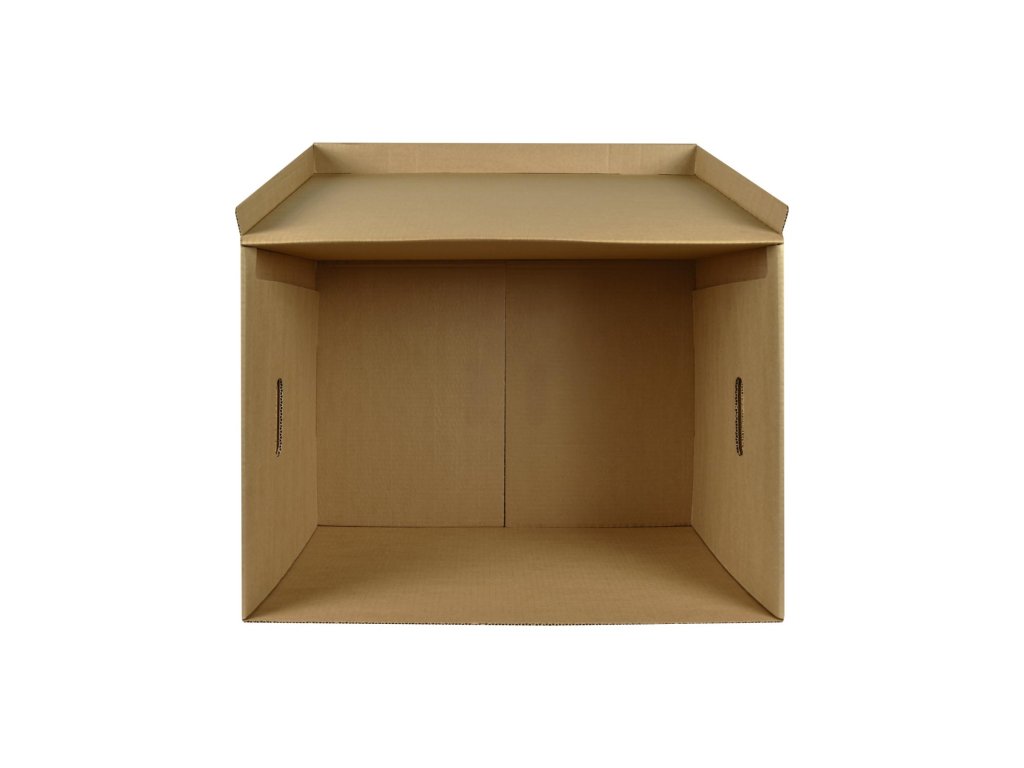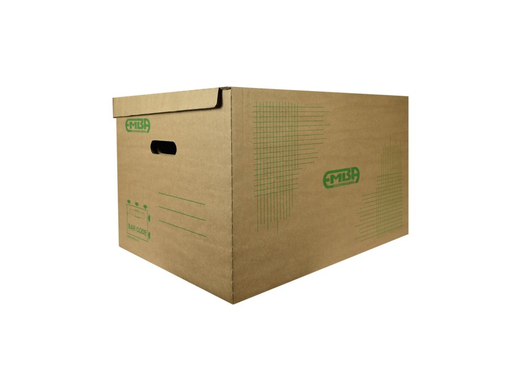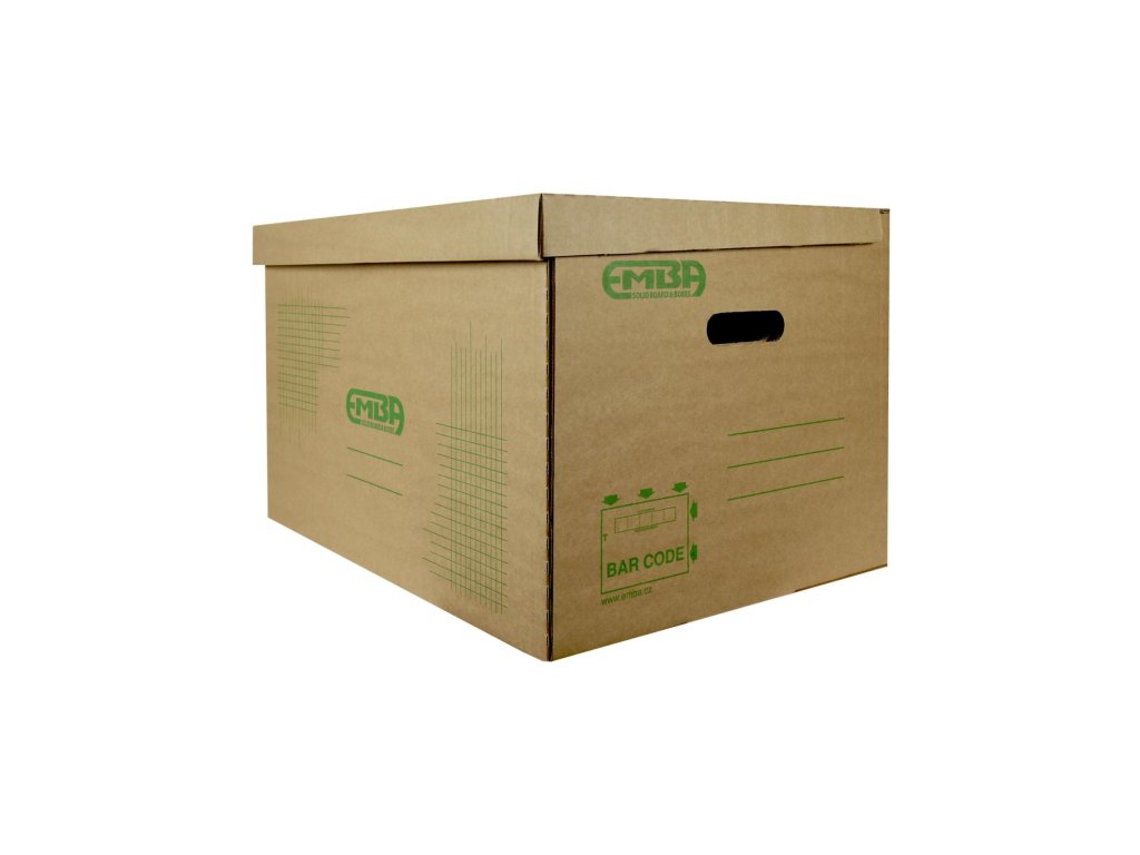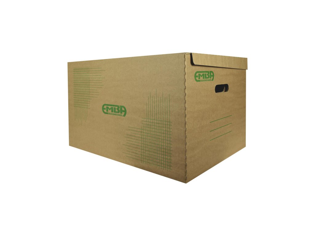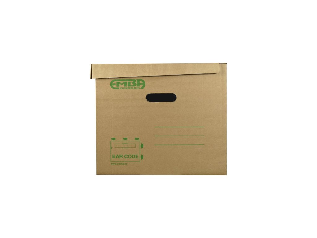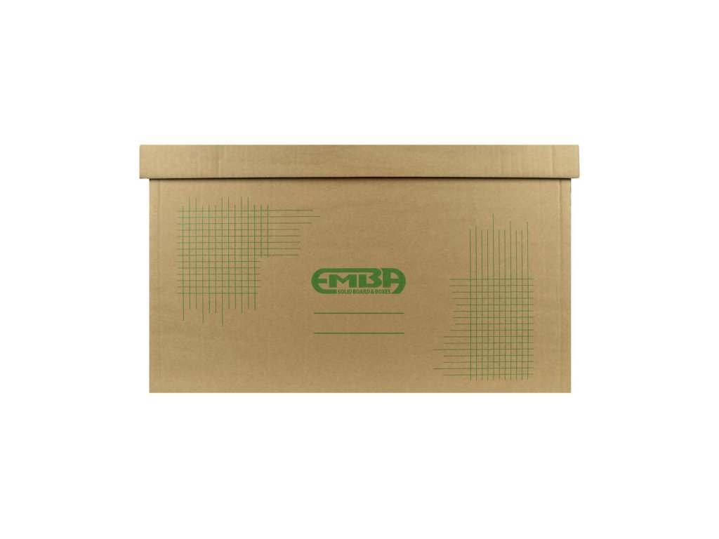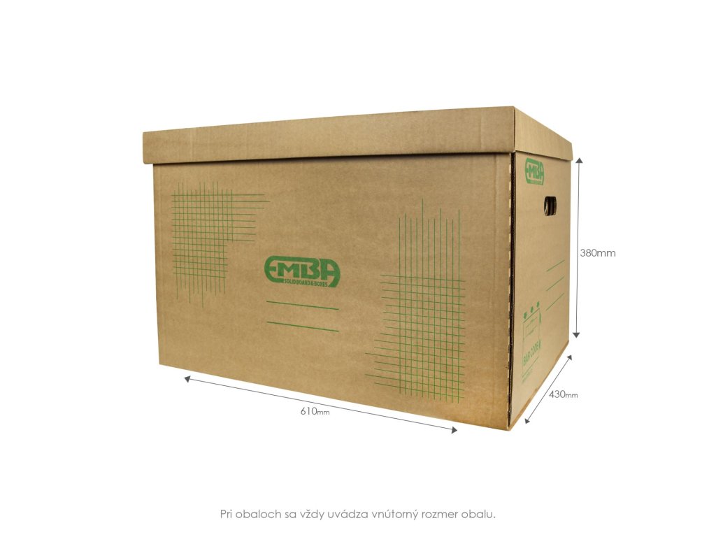 Sťahovací hnedý box s kvalitnou zelenou sieťotlačou vyrobený z recyklovateľnej hnedej vlnitej lepenky. Konštrukčné riešenie krabice umožňuje rýchly prístup k uloženým dokumentom alebo predmetom. Konštrukcia je spevnená zosilnením bočných stien. Maximálna nosnosť 100 kg. Rozmery 610 × 430 × 380 mm.Dodatočné parametre