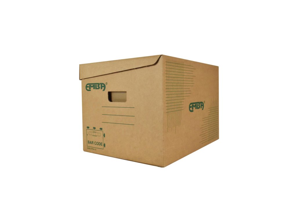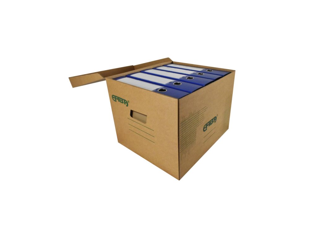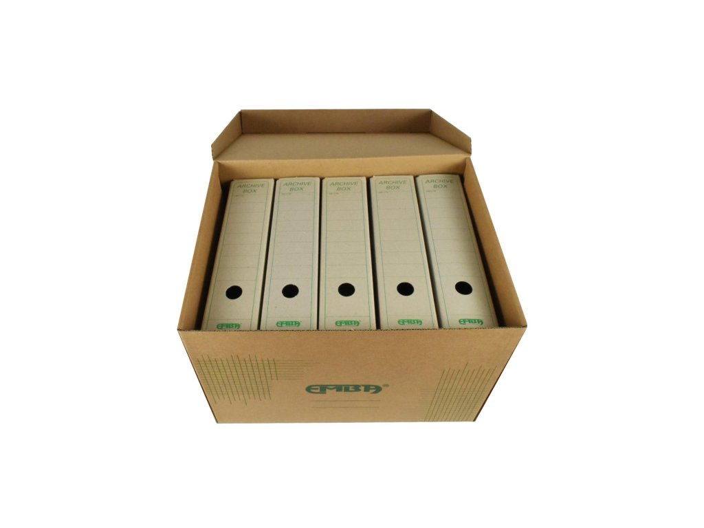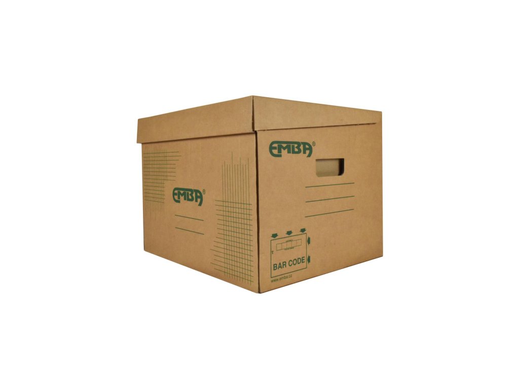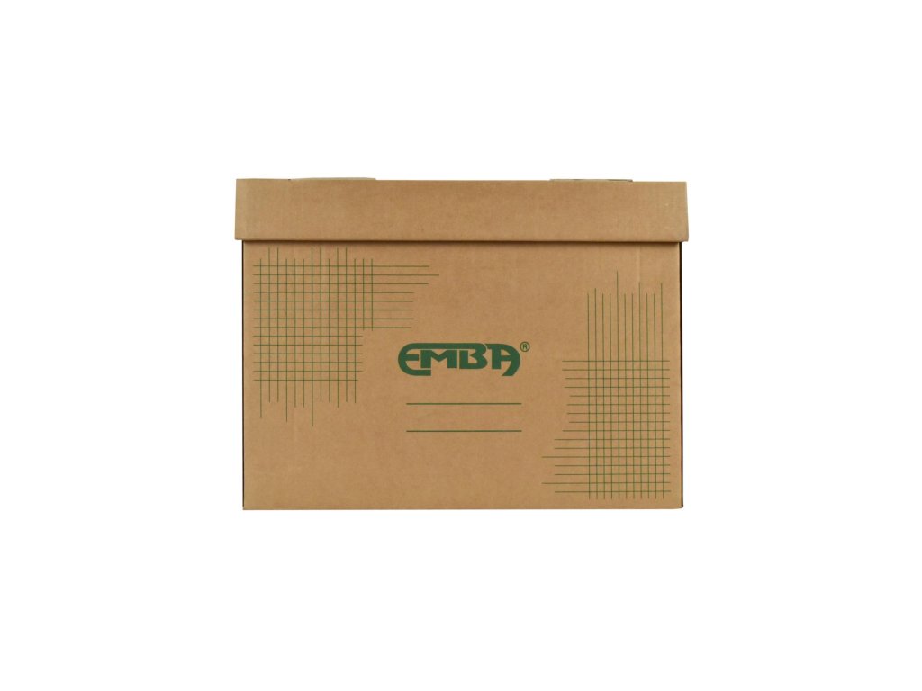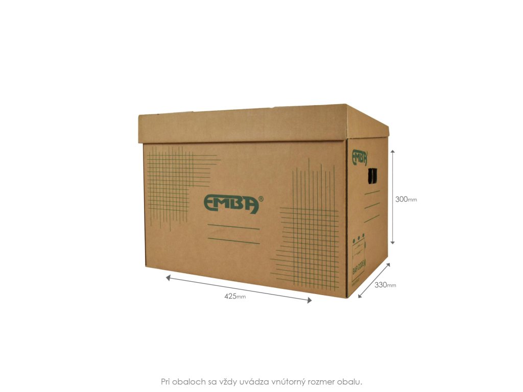 Škatuľa z hnedej vlnitej lepenky so sklápacím vekom a zelenou potlačou na ukladanie a archiváciu 5 zakladačov šírky 8 cm alebo archívnych boxov I/-75 mm. Rozmery (š x v x d) 425 x 330 x 300 mm. Nosnosť 100 Kg.Dodatočné parametre