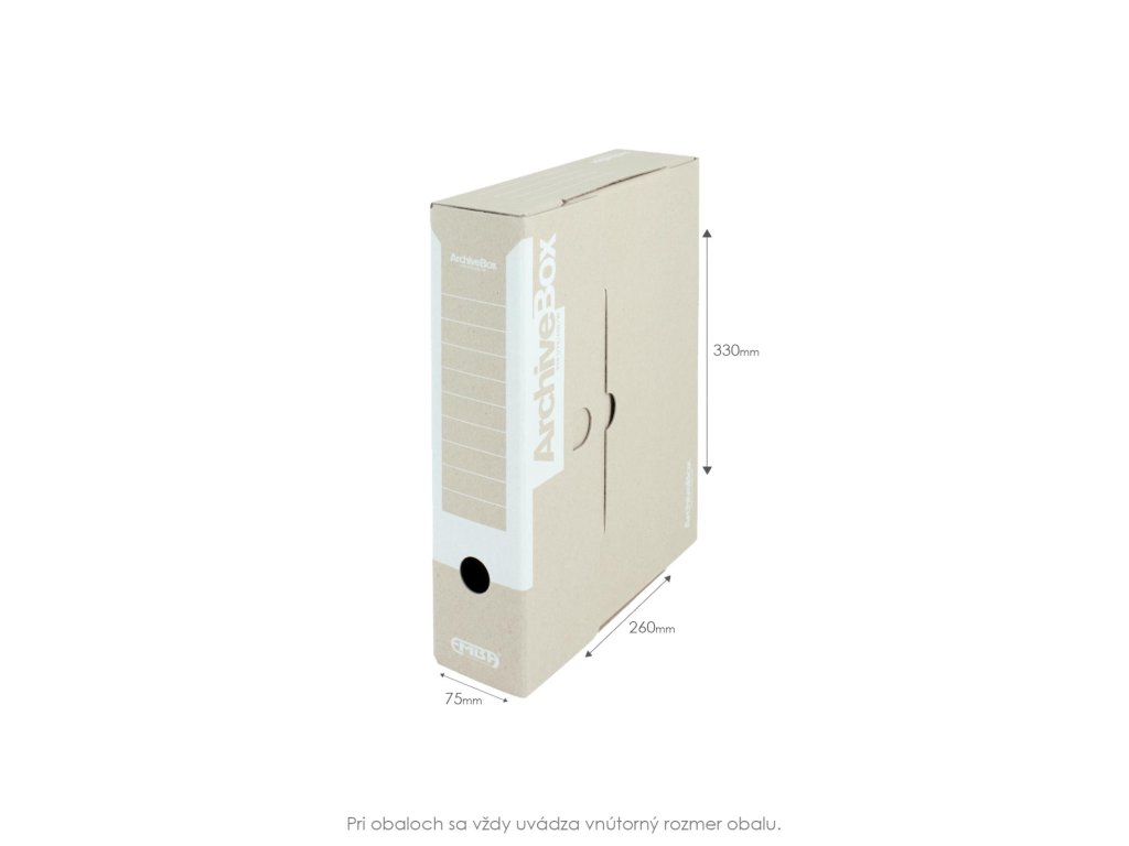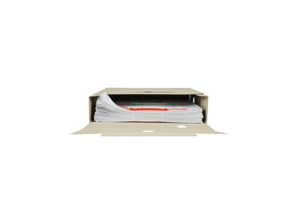 Systém archívnych boxov a škatúľ z vlnitej lepenky. Dodávané v rozloženom stave. Farba prírodná hnedá. Archívny box z hladkej ručnej lepenky, 1 000 g/ m². Konštrukčné riešenie boxu umožňuje rýchly prístup k vloženým dokumentom. Rozmery75 × 330 × 260 mm. Väčšie balenie 25 ks. Farba biela.