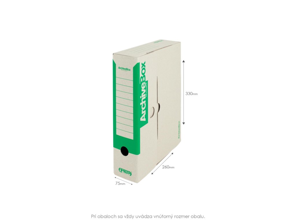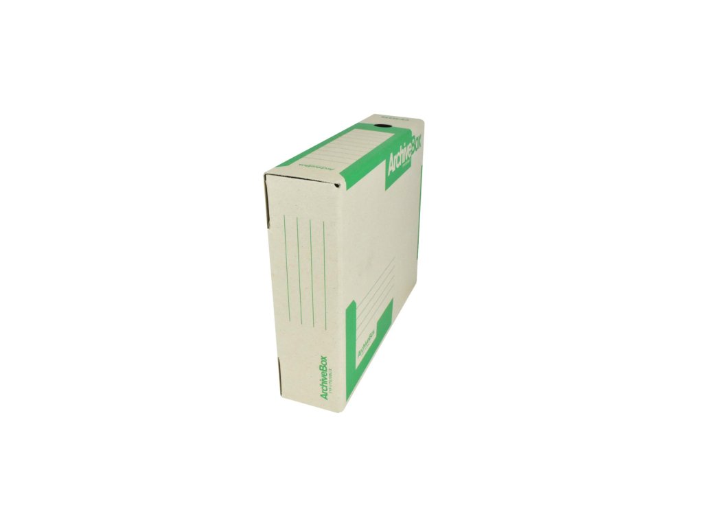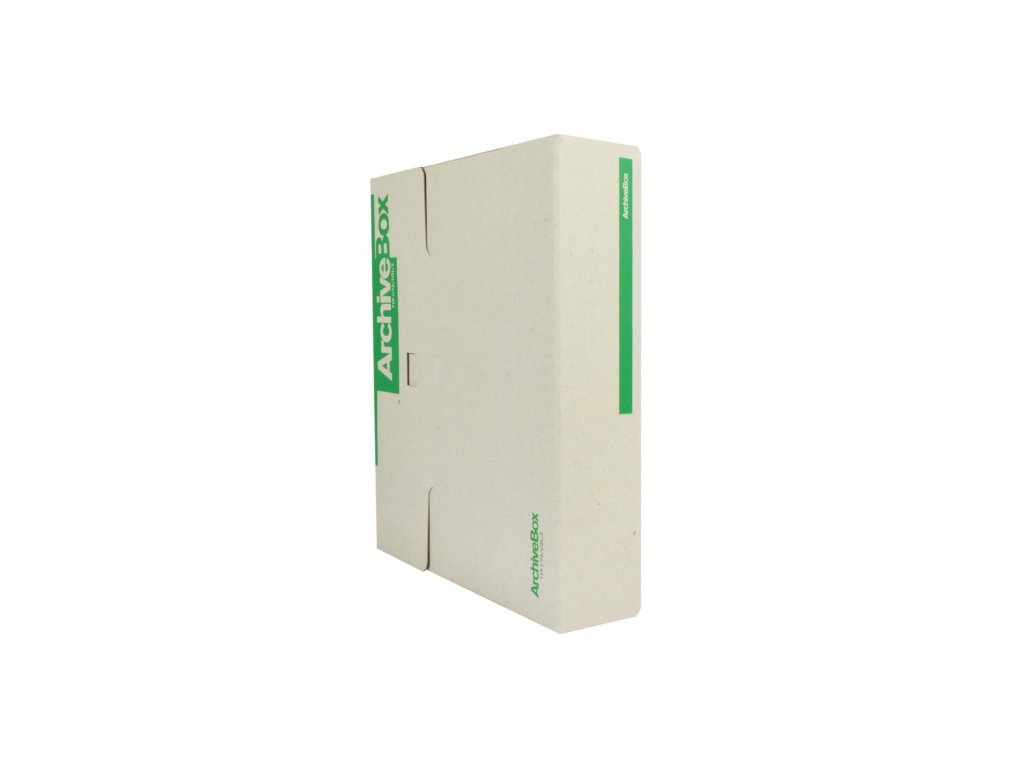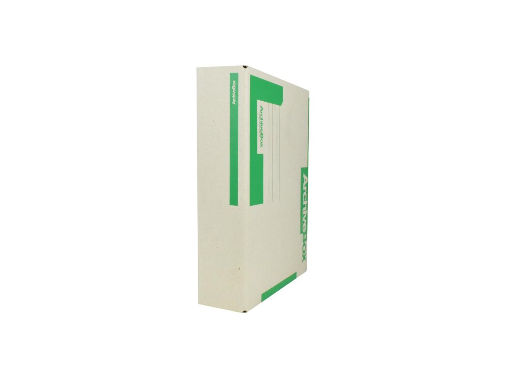 Systém archívnych boxov a škatúľ z vlnitej lepenky. Dodávané v rozloženom stave. Farba prírodná hnedá. Archívny box z hladkej ručnej lepenky, 1 000 g/ m². Konštrukčné riešenie boxu umožňuje rýchly prístup k vloženým dokumentom. Rozmery75 × 330 × 260 mm. Väčšie balenie 25 ks. Farba zelená.