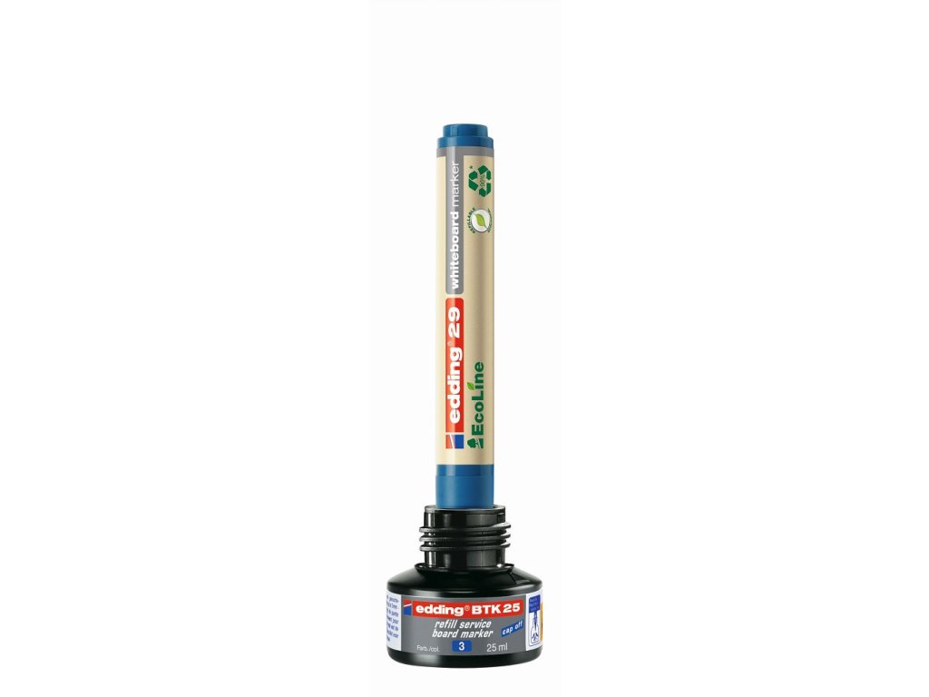 Atrament slabého zápachu s kapilárnym systémom na dopĺňanie popisovačov edding 250, 360, 361 a 363, určených na biele tabule. Tento chemický prípravok je nebezpečný. Obsah fľaštičky 25 ml.Pri doĺňaní vložte prednú časť popisovača špičkou do fľaštičky a po niekoľkých minútach bude popisovač pripravený k opätovnému použitiu.Farba: modrá