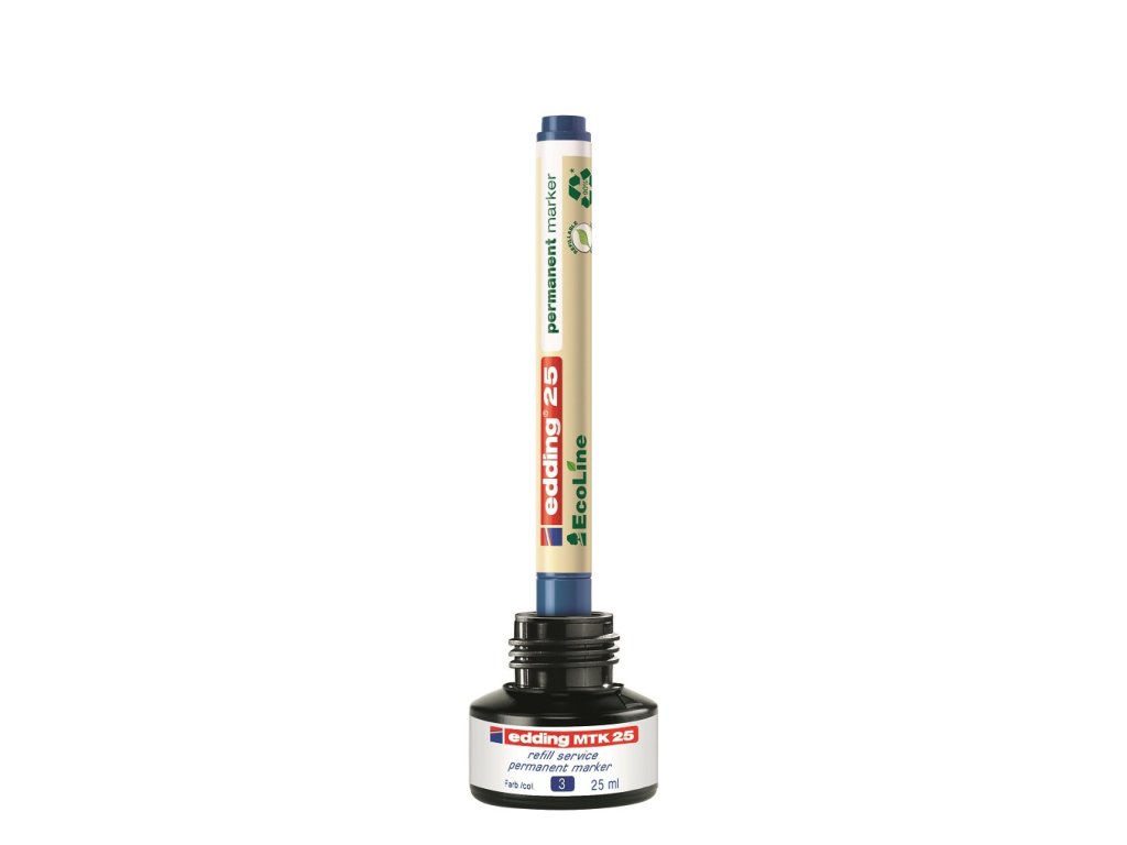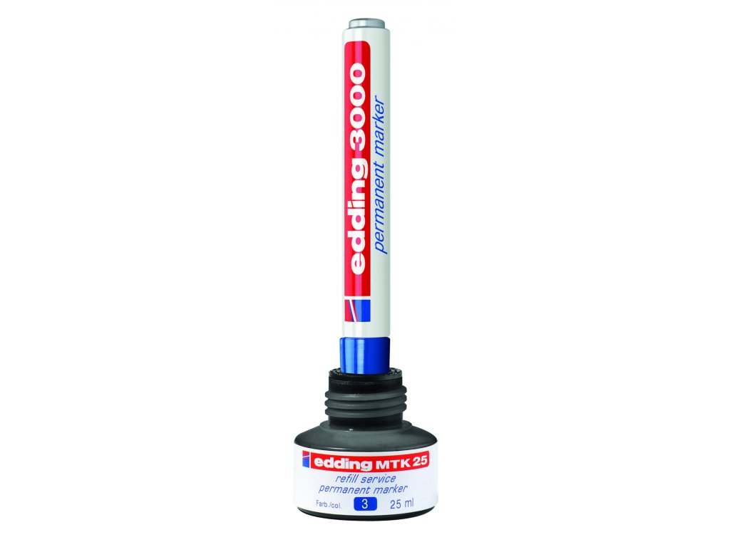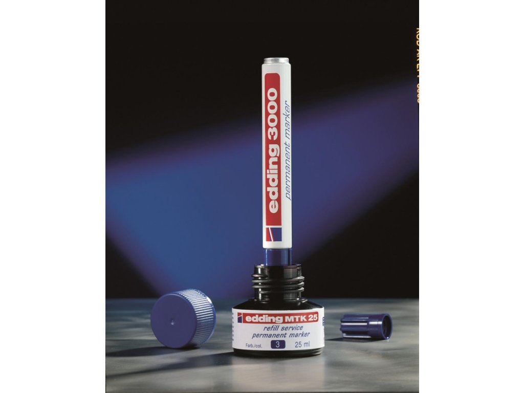 Atrament slabého zápachu s kapilárnym systémom na dopĺňanie permanentných popisovačov edding 2000/-2000 C, 2200/-2200 C, 400, 300, 330 a 370. Obsah 25 ml. Tento chemický prípravok je nebezpečný. Pri dopĺňaní vložte prednú časť popisovača špičkou do fľaštičky a po niekoľkých minútach bude popisovač pripravený k opätovnému použitiu. Obsah 25 ml.Farba: modrá