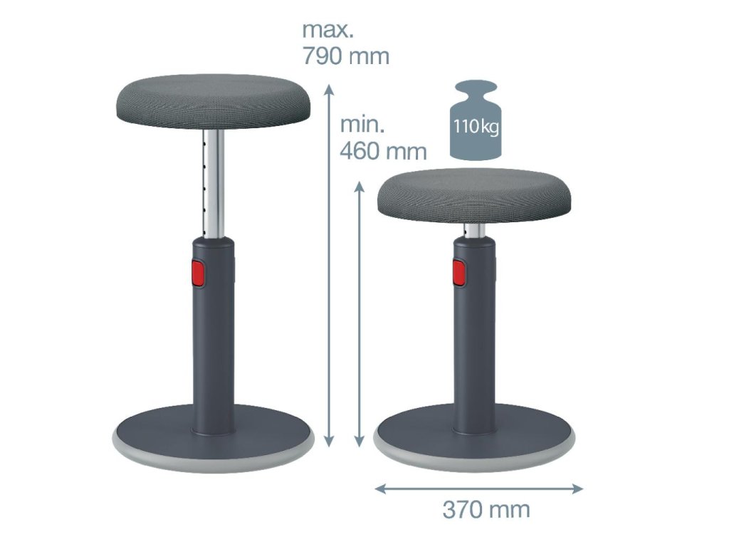 Ergonomická stolička Leitz Ergo umožňuje flexibilný pohyb medzi sedením a státím pri práci, podporuje pohyb svalov, zlepšuje držanie tela a zvyšuje hladinu energie. Má zaoblenú základňu, ktorá podporuje aktívny pohyb otáčaním a hojdaním. Pri práci zároveň posilňujete chrbtové svaly. Výšku možno ľahko nastaviť v rozmedzí 46-79 cm, stolička zostáva pevná a stabilná v akejkoľvek výške. Stolička je pohodlná a praktická, má sedadlo z priedušnej 3D peny potiahnuté vzdušnou sieťovinou protišmykovú základňu, ktorá nepoškodí podlahu. Maximálna nosnosť: 110 kg. Farba sivá.Dodatočné parametre