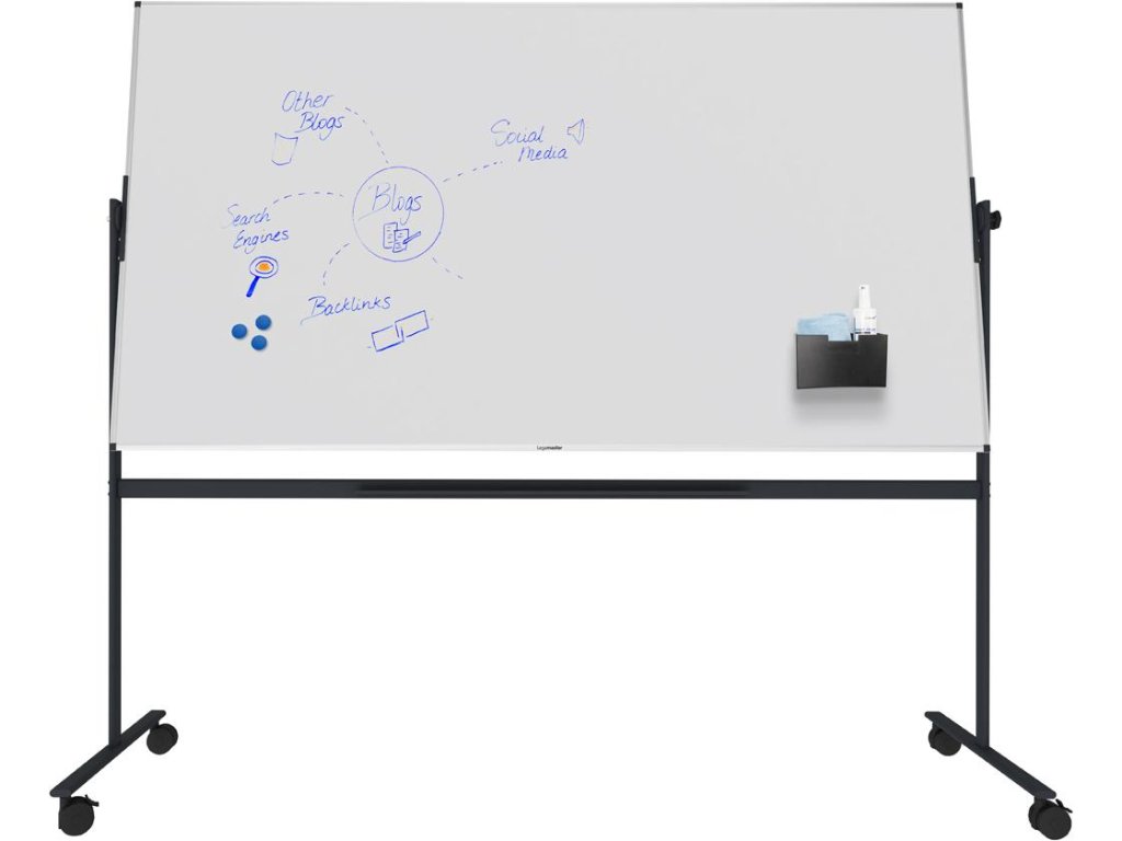 Magnetická tabuľa odolná voči poškriabaniu so smaltovaným oceľovým povrchom s použitím e3 Ceramic Steel, ktorá má certifikáciu Cradle to Cradle Certified™ na úrovni bronzu. Upevnená na robustnom a mobilnom stojane s otočnou osou 360° a 4 kolieskami (2 uzamykateľné). Súčasťou balenia je odkladacia lišta. Rozmery: 120 × 220 cm.Dodatočné parametre