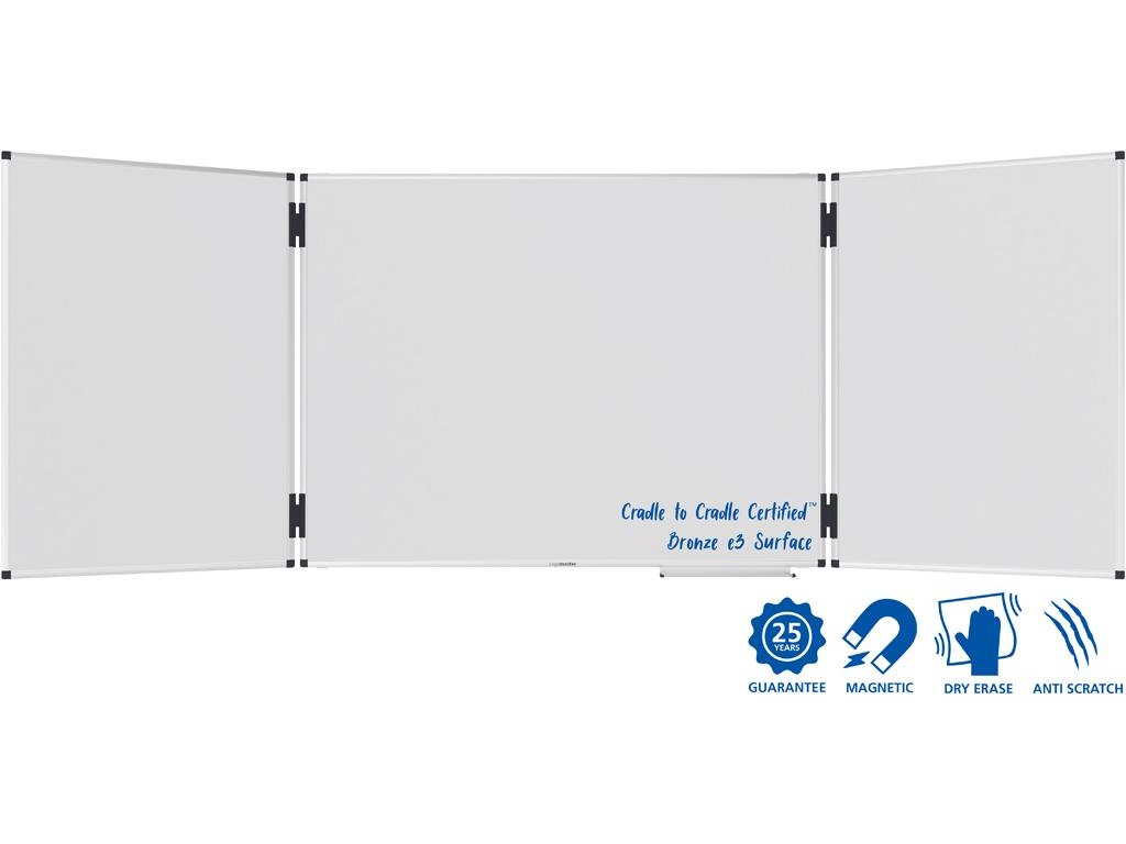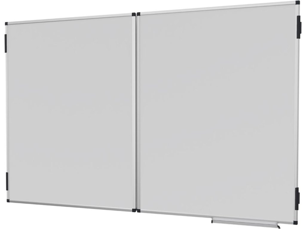 Rozkladacia hybridná magnetická tabuľa s dostatkom miesta na písanie, pripevňovanie poznámok a obrázkov v konferenčných miestnostiach alebo učebniach. Dve obojstranné výklopné krídla, ktoré možno zaaretovať pomocou klipov. Vhodné na písanie fixkami na tabuľu stierateľnými za sucha. Vrátane odkladacej lišty (30 cm), montážnej sady a montážneho návodu. Rozmer 100 x 200 cm.Dodatočné parametre