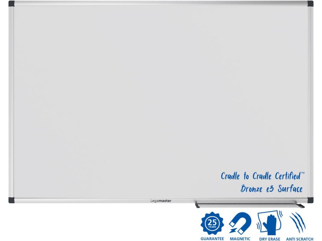 Robustná a udržateľná tabuľa na časté používanie v kancelárii, triede alebo v priemyselnom prostredí. Vhodná na písanie fixkami na tabuľu stierateľnými za sucha. Magnetický smaltovaný oceľový povrch s použitím e3 Ceramic Steel, ktorá má certifikáciu Cradle to Cradle Certified™ na úrovni bronzu. Hliníkový rám so sivými plastovými rohovými krytkami (Pantone 433C). Možno namontovať horizontálne alebo vertikálne. Vrátane držiaka popisovačov (30 cm), montážnej sady a montážneho návodu. Rozmery: 60 x 90 cm.Dodatočné parametre