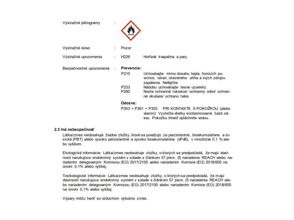 V súlade s nariadeniami 453/2010 a 1272/2008 Klasifikácia v súlade s nariadením 1272/2008 Horľavé kvapaliny (kategória 3). Klasifikácie v súlade s nariadením 1999/45/ES. Informácie na etikete v súlade s nariadením 1272/2008.