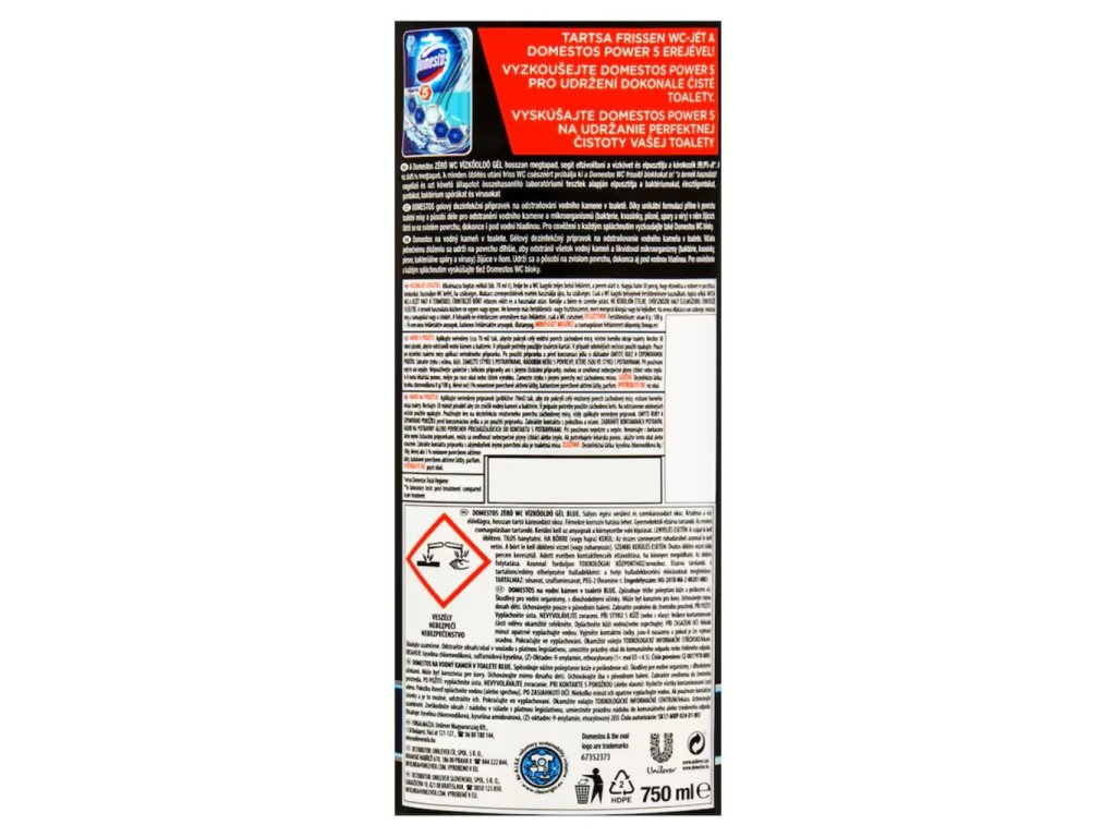 Domestos na vodný kameň v toalete. Gélový dezinfekčný prípravok na odstraňovanie vodného kameňa v toalete. Vďaka jedinečnému zloženiu sa udrží na povrchu dlhšie, aby odstránil všetok vodný kameň a likvidoval mikroorganizmy (baktérie, kvasinky, plesne, bakteriálne spóry a vírusy) žijúce v ňom. Udrží sa a pôsobí na zvislom povrchu, dokonca aj pod vodnou hladinouBiocídny výrobok! Používajte biocídy bezpečným spôsobom. Pred použitím si vždy prečítajte etiketu a informácie o výrobku.