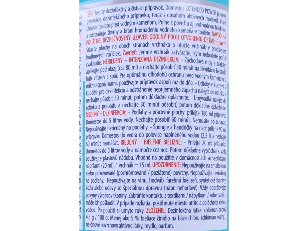 Hustý gel a úsporné dávkovanie odstraňuje mastnotu, zažranú špinu a škvrny. Ničí všetky baktérie. Domestos Extended Power je nová generácia dezinfekčného prípravku, teraz s obsahom aktívnych molekúl, ktoré chránia toaletu pred vodným kameňom. Priľne k povrchu aj pod vodnou hladinou a odstraňuje škvrny a bráni hromadeniu vodného kameňa v toalete. Objem 750 ml.Zloženie