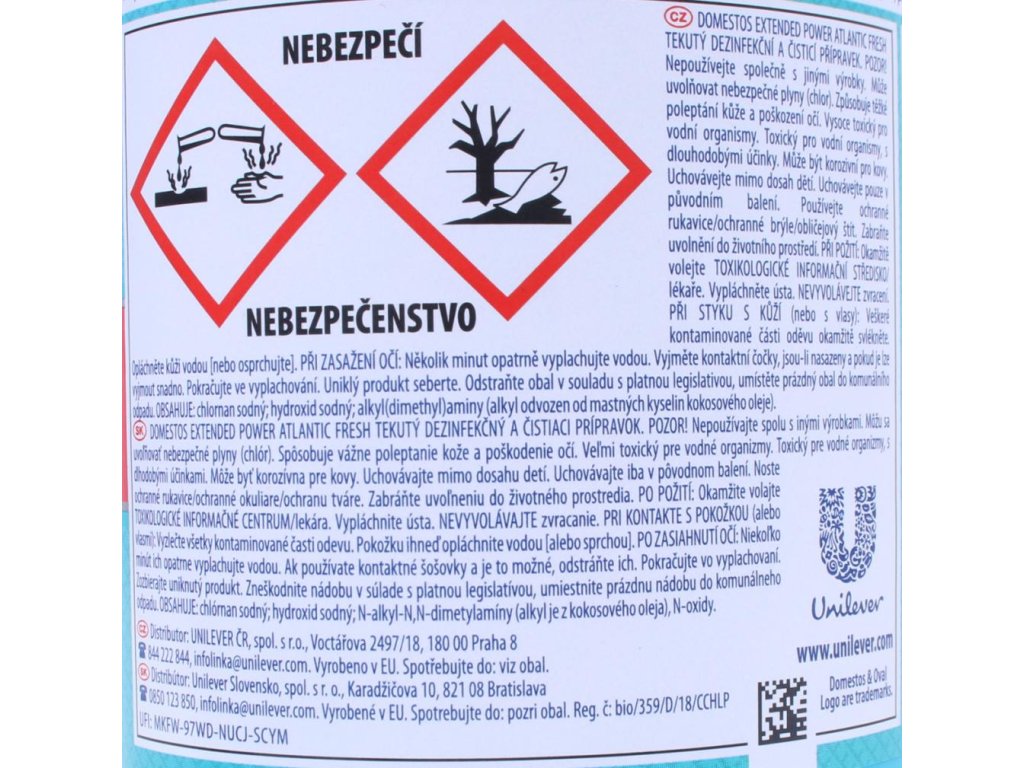 POZOR! Nepoužívajte spolu s inými výrobkami. Môžu sa uvoľňovať nebezpečné plyny (chlór). Spôsobuje vážne poleptanie kože a poškodenie očí. Veľmi toxický pre vodné organizmy. Môže byť korozívna pre kovy. Uchovávajte mimo dosahu detí. Uchovávajte iba v pôvodnej nádobe. Zabráňte uvoľneniu do životného prostredia. Noste ochranné rukavice/ochranný odev/ochranné okuliare/ochranu tváre. PRI KONTAKTE S POKOŽKOU (alebo vlasmi): Všetky kontaminované časti odevu okamžite vyzlečte. Pokožku opláchnite vodou/sprchou. PO ZASIAHNUTÍ OČÍ: Niekoľko minút ich opatrne vyplachujte vodou. Ak používate kontaktné šošovky a ak je to možné, odstráňte ich. Pokračujte vo vyplachovaní. Okamžite volajte TOXIKOLOGICKÉ INFORMAČNÉ CENTRUM/lekára. Zozbierajte uniknutý produkt. OBSAHUJE: chlórnan sodný; hydroxid sodný; N-alkyl-N,N-dimetylamíny (alkyl je z kokosového oleja), N-oxidy.