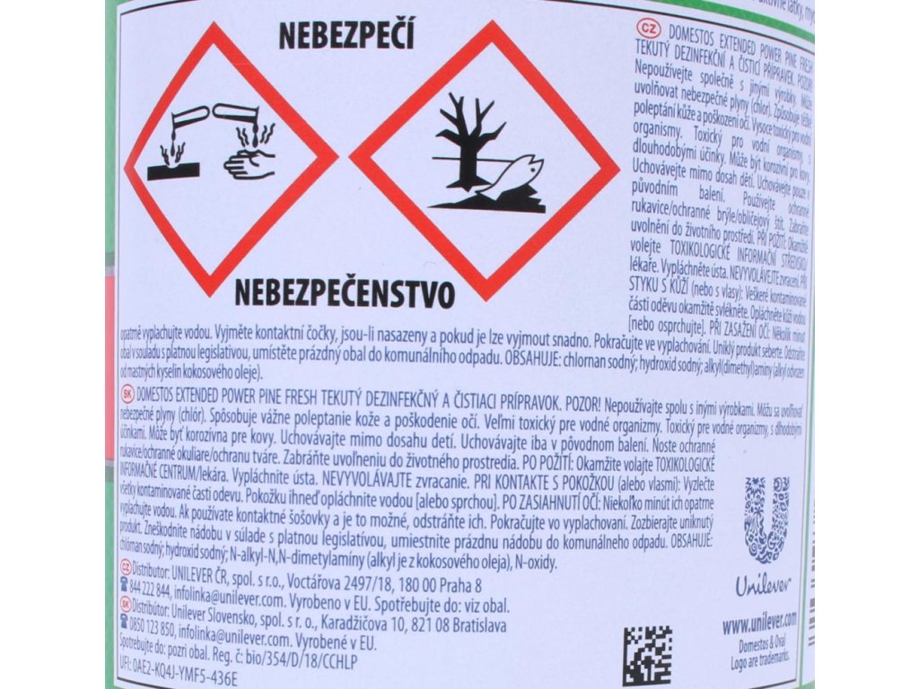 POZOR! Nepoužívajte spolu s inými výrobkami. Môžu sa uvoľňovať nebezpečné plyny (chlór). Spôsobuje vážne poleptanie kože a poškodenie očí. Veľmi toxický pre vodné organizmy. Môže byť korozívna pre kovy. Uchovávajte mimo dosahu detí. Uchovávajte iba v pôvodnej nádobe. Zabráňte uvoľneniu do životného prostredia. Noste ochranné rukavice/ochranný odev/ochranné okuliare/ochranu tváre. PRI KONTAKTE S POKOŽKOU (alebo vlasmi): Všetky kontaminované časti odevu okamžite vyzlečte. Pokožku opláchnite vodou/sprchou. PO ZASIAHNUTÍ OČÍ: Niekoľko minút ich opatrne vyplachujte vodou. Ak používate kontaktné šošovky a ak je to možné, odstráňte ich. Pokračujte vo vyplachovaní. Okamžite volajte TOXIKOLOGICKÉ INFORMAČNÉ CENTRUM/lekára. Zozbierajte uniknutý produkt. OBSAHUJE: chlórnan sodný; hydroxid sodný; N-alkyl-N,N-dimetylamíny (alkyl je z kokosového oleja), N-oxidy.