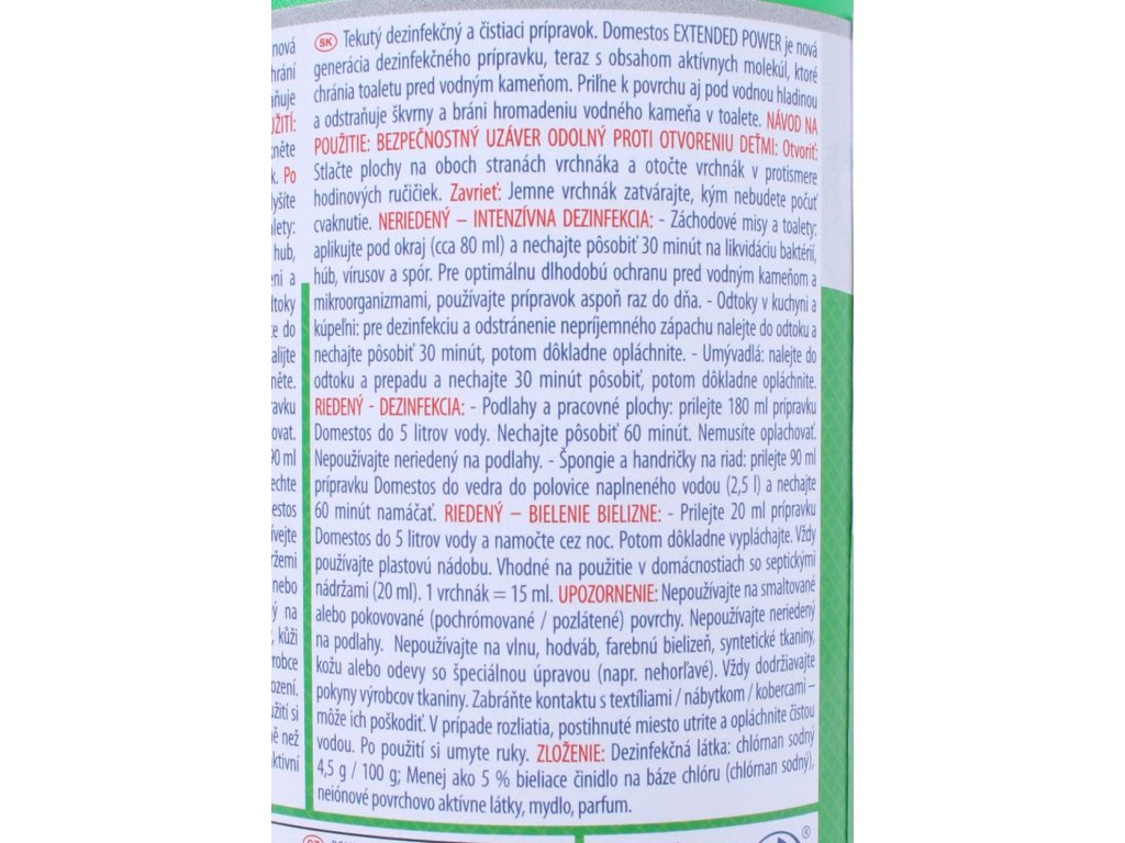 Hustý gel a úsporné dávkovanie odstraňuje mastnotu, zažranú špinu a škvrny. Ničí všetky baktérie.Domestos Extended Power je nová generácia dezinfekčného prípravku, teraz s obsahom aktívnych molekúl, ktoré chránia toaletu pred vodným kameňom. Priľne k povrchu aj pod vodnou hladinou a odstraňuje škvrny a bráni hromadeniu vodného kameňa v toalete. Objem 750 ml.Dezinfekčná látka: chlórnan sodný 4,5 g / 100 g, Menej ako 5 % bieliace činidlo na báze chlóru (chlórnan sodný), Neiónové povrchovo aktívne látky, Mydlo, Parfum.