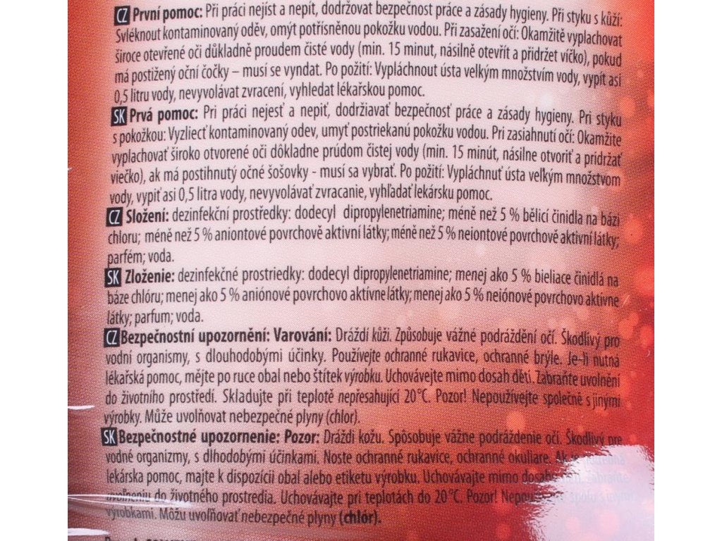 dráždi kožu. Spôsobuje vážne podráždenie očí. Škodlivý pre vodné organizmy, s dlhodobými účinkami.Používajte ochranné rukavice a okuliare.Ak je potrebná lekárska pomoc, majte po ruke obal alebo etiketu výrobku. Uchovávajte mimo dosahu detí.Zabránte uvoľneniu do životného prostredia. Uchovávajte pri teplotách do 20 C. Nepoužívajte spolu s inými výrobkami. Môžu uvoľňovať nebezpečné plyny (chlór).