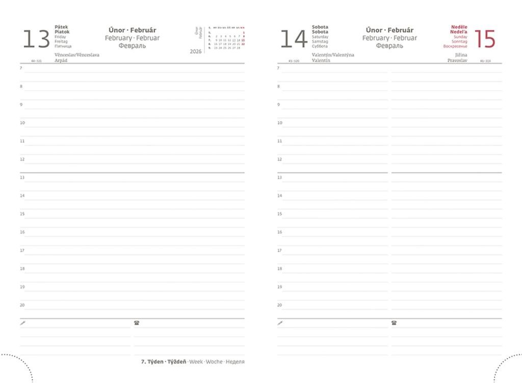 Matná koženka Vivella predstavuje kvalitný, na dotyk príjemný a zároveň veľmi obľubený materiál. Hrúbka materiálu umožňuje dosiahnuť perfektné výsledky pri razbe bez fólie.Diár obsahuje: osobné údaje, plánovač dovolenky (mesačný prehľad), plánovací kalendár, telefónne predvoľby, štátne sviatky Českej a Slovenskej republiky, medzinárodné sviatky, ročný výhľad, denný layout, adresár, mapa Európy a Českej a Slovenskej republiky.