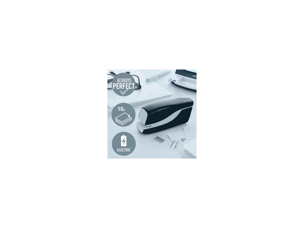 Elektrická zošívačka Leitz New NeXXt WOW. Vďaka jednoduchému ovládaniu jednou rukou je ideálna na časté používanie.