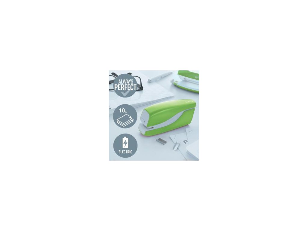 Elektrická zošívačka Leitz New NeXXt WOW. Vďaka jednoduchému ovládaniu jednou rukou je ideálna na časté používanie.