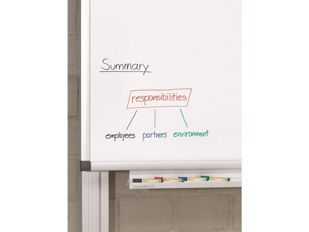 Popisovač na biele tabule, za sucha stierateľný prakticky zo všetkých neporóznych povrchov, ako je keramická úprava, melamín i sklo. Minimálne 80 % plastovej časti je vyrobených z recyklovaného materiálu. Okrúhly hrot, šírka stopy 1,5 - 3 mm. Rýchloschnúci, vodeodolný, slabo zapáchajúci atrament intenzívnej farby. Krátky čas vydrží neuzavretý bez vyschnutia. Väčšie balenie 10 ks.Farba: modrá