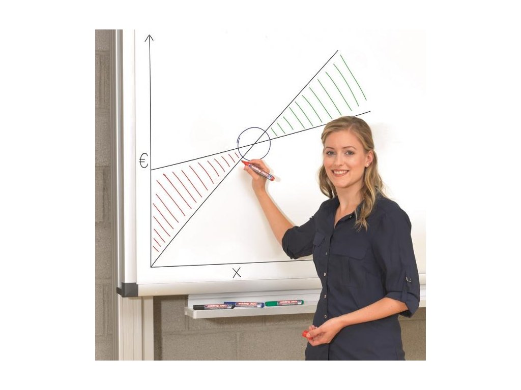 Popisovač vhodný na biele tabule, stierateľný za sucha. Plnený pigmentovým atramentom slabého zápachu bez prísady butylacetátu s vlastnosťou „Cap off“, zabraňujúcou vysychaniu atramentu pri otvorenom hrote aj niekoľko dní. Dopĺňateľný atramentom edding BTK 25. Plastové telo, vymeniteľný hrot. Hrot okrúhly, šírka stopy 1,5---3 mm. Väčšie balenie 10 ks.Farba: červená