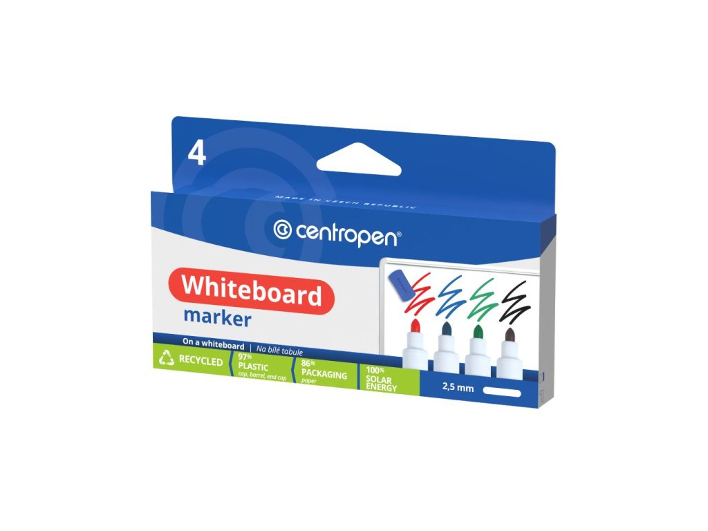 Za sucha stierateľný svetlostály popisovač. Vhodný na biele smaltované tabule, PVC, sklo, porcelán. Okrúhly hrot hrúbky 5 mm. Šírka stopy 2,5 mm. Sada 4 ks.Farba: mix 4 farieb
