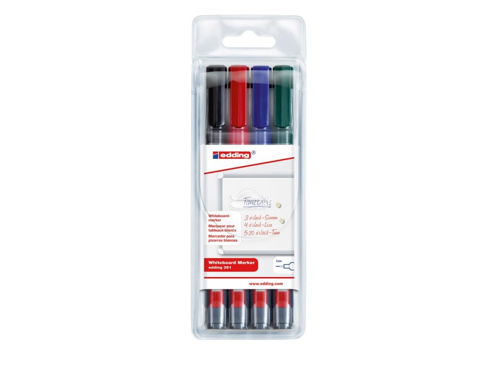 Popisovač na biele tabule za sucha stierateľné s plastovým telom a vymeniteľným hrotom. Dopĺňateľný atramentom edding BTK 25 alebo BT 30. Plastové telo, vymeniteľný hrot. Hrot okrúhly, šírka stopy 1 mm. Sada 4 ks v mixe farieb.Farba: sada 4 farieb