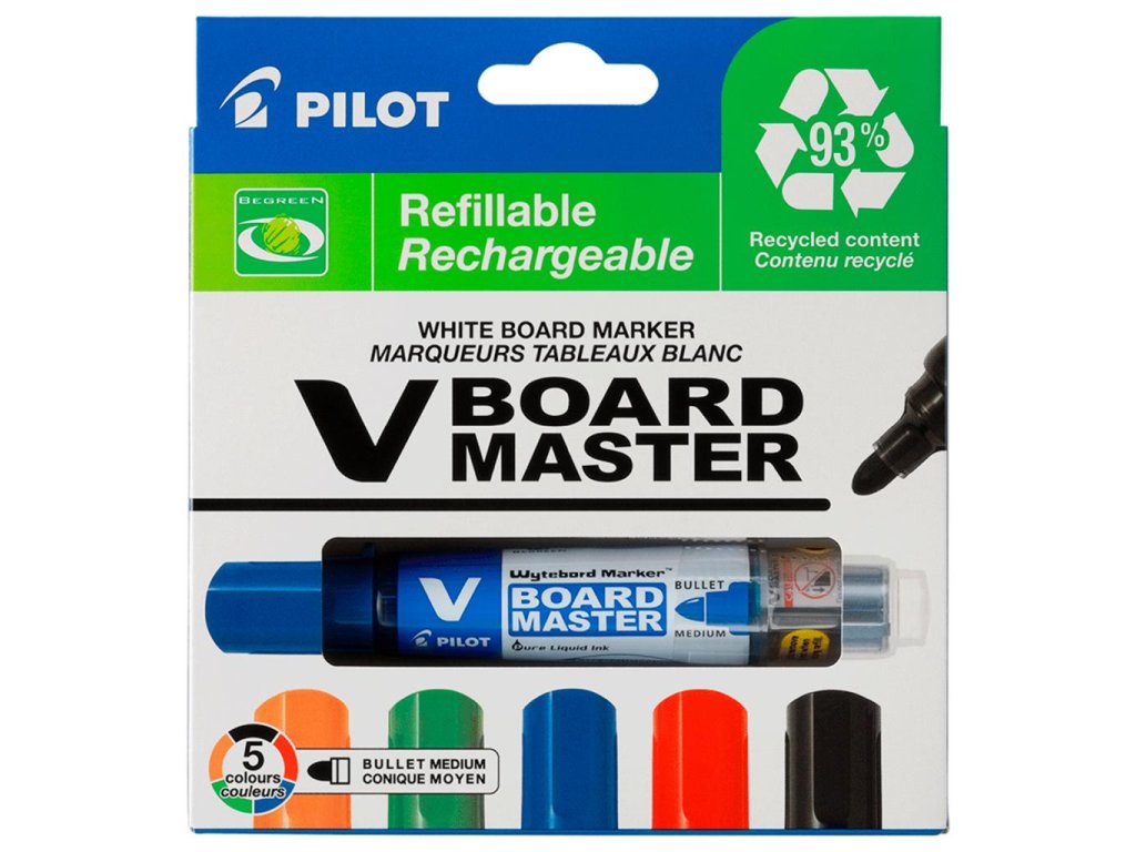 Technická inovácia, V-BOARD MASTER sú popisovače na biele tabule s vymeniteľnou náplňou s tekutým atramentom. Nový atramentový systém ponúka okamžité písanie bez pretrepávania či pumpovanie, rovnako ako plynulý výdaj atramentu: zabudnime na popisovače, ktoré píšu čím ďalej tým menej, čím viac sa používajú. Budete nadšení intenzívnymi a žiarivými farbami V-BOARD MASTER. Táto rukoväť je súčasťou série Begreen, vyrobené z recyklovaného plastu. Spoločne môžeme veľa vecí zmeniť, a pomôcť tak chrániť surovinové zdroje našej planéty. Výrobou V-Board Master Popisovač z recyklovaného plastu znižuje Pilot uhlíkovú stopu pera v porovnaní s rovnakým perom vyrábaným bez využitia recyklovaného plastu. Tým to ale nekončí: Ak aspoň trikrát vymeníte náplň, vyrovnáte tak emisie oxidu uhličitého. Od výroby až do konca životnosti výrobku sa odhaduje, že nákup tohto pera Begreen a jeho trojnásobné doplnenie náhradnou náplňou zníži celkový vplyv pera na životné prostredie o -75%** v porovnaní s nákupom ďalších 3 nových pier. Aj tak malé gesto môže významne zmeniť náš boj proti zmene klímy!