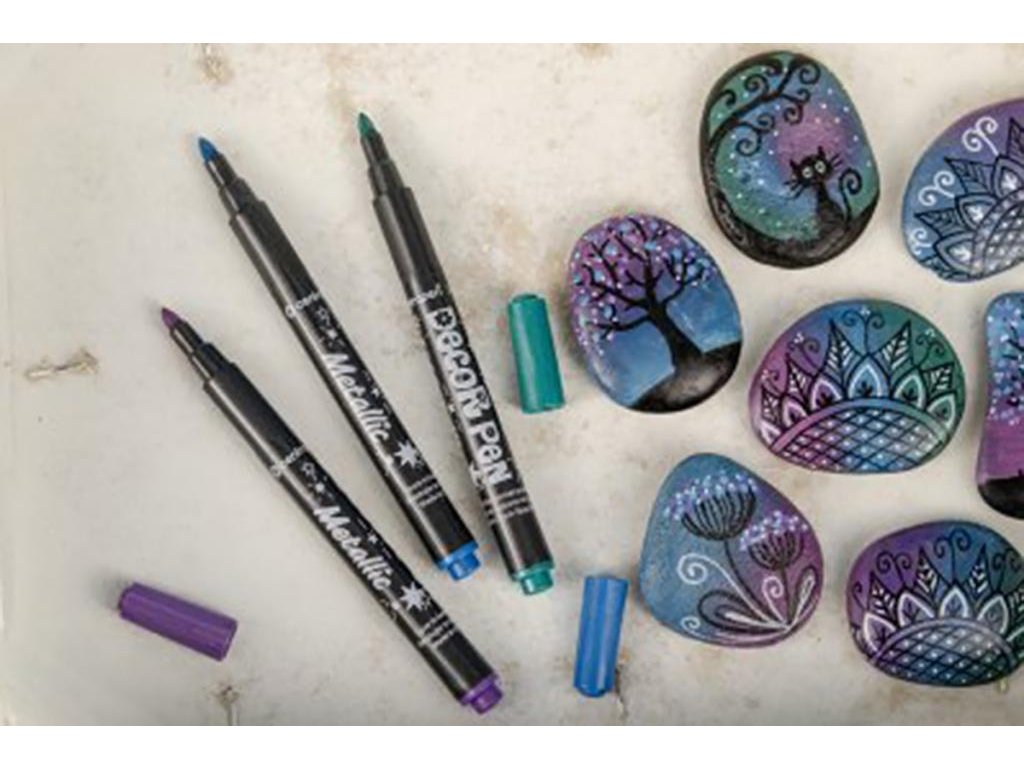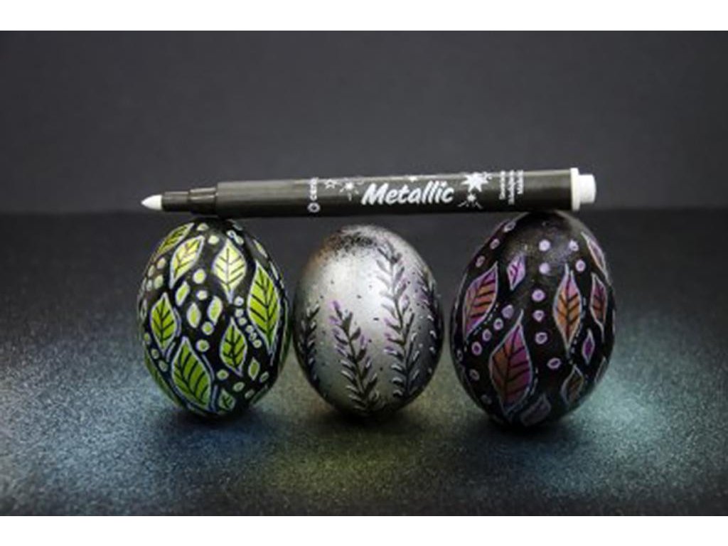 Sada 8 metalických odtieňov a 1 biely popisovač určený k dekorácii rôznych materiálov (lakový papier, kov, sklo, fólia, keramika, kraslica, kameň). Svetlostály pigmentový atrament na vodnej báze. Stopa písma je výrazne sýta, permanentná, svetlostála. Po dokonalom zaschnutí (min. 4 hod.) sa stopa stáva odolnou voči oteru a na poréznych povrchoch i vode. Z neporéznych materiálov možno zmyť vodou so saponátmi. Šírka stopy 1,5 mm. Skladujte vo vodorovnej polohe.Dodatočné parametre