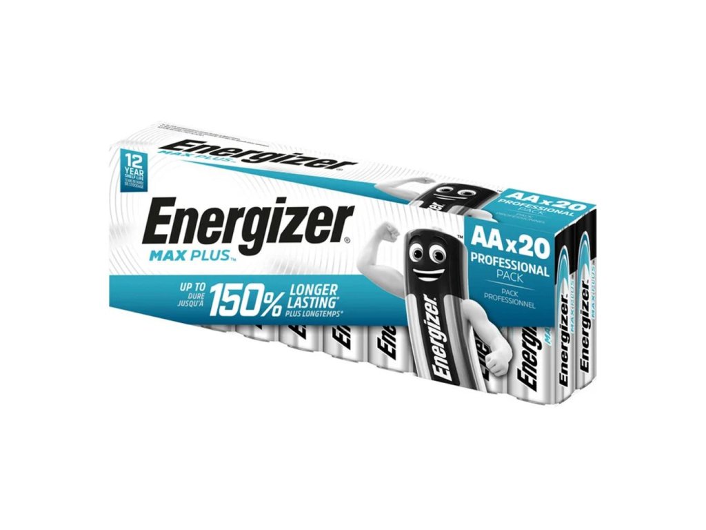 Alkalické jednorazové batérie Energizer MAX Plus AA/LR6 s max výkonom pre Hi-Tech použitie a do spotrebičov s vyšším odberom energie (digitálne fotoaparáty). S extra dlhou životnosťou, neobsahujú kadmium ani meď. Odolávajú teplotám od -18 °C po +55 °C. Balenie 20 ks.Dodatočné parametre