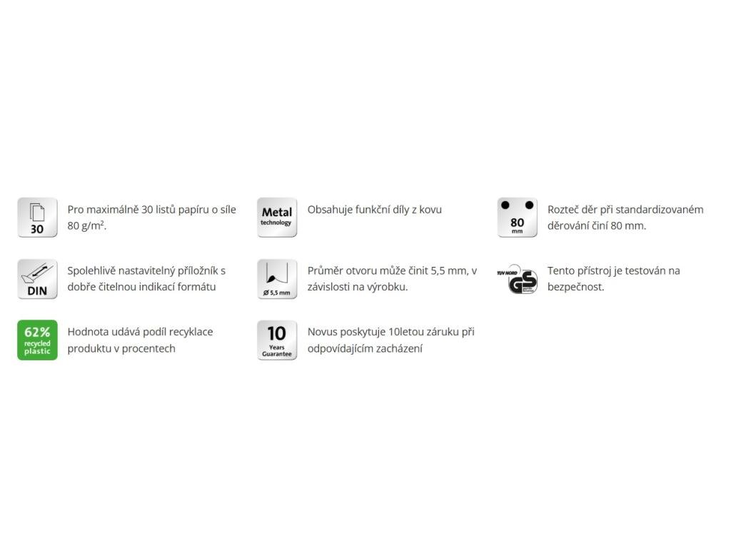 Výkonná celokovová kancelárska dierovačka pre profesionálne použitie z kolekcie šetrnej k životnému prostrediu re+new, s lesklou vrchnou časťou zo 62% recyklovaného plastu, posuvným pravítkom a aretáciou spodnej polohy. Tvorí vhodný doplnok k zošívačke B 4 FC re+new. Rozpätie dier 8 cm priemer dier 5,5 mm. Hmotnosť 350 g. Záruka 10 rokov. Kapacita dierovania 30 listov. Farba čierna.Dodatočné parametre