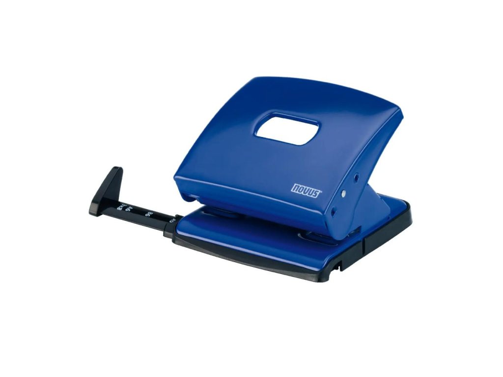 Celokovová kancelárska dierovačka s posuvným pravítkom a plastovým poťahom v dizajne zošívačky Novus C2 a C-STABIL. Rozpätie dier 8 cm. Hmotnosť 350 g. Záruka 10 rokov.Farba: modrá