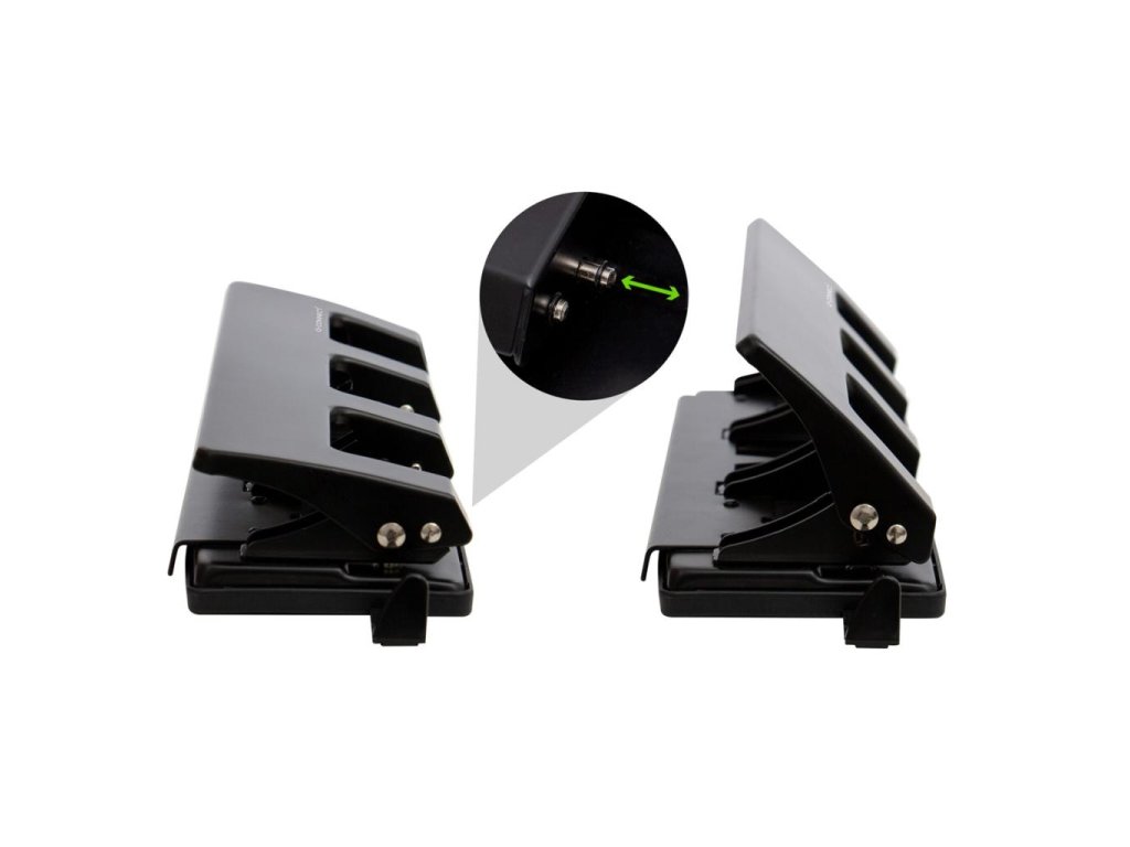 Dierovačka so štyrmi dierovacími otvormi a so štandardným rozstupom 8cm x 8cm x 8cm. Medzi funkcie patrí uzamykací mechanizmus pre jednoduché skladovanie a integrované vedenie papiera pre presné dierovanie. Kapacita papiera - 25 listov s gramážou 80 g/m². Farba čierna.Dodatočné parametre