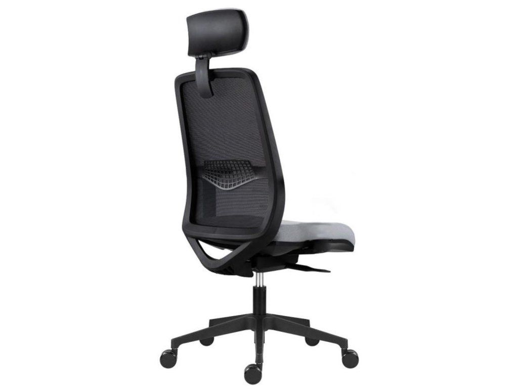 • kancelárska stolička s čiernou sieťovinou na operadle, podhlavníkom a nastaviteľnou bedrovou výstuhou