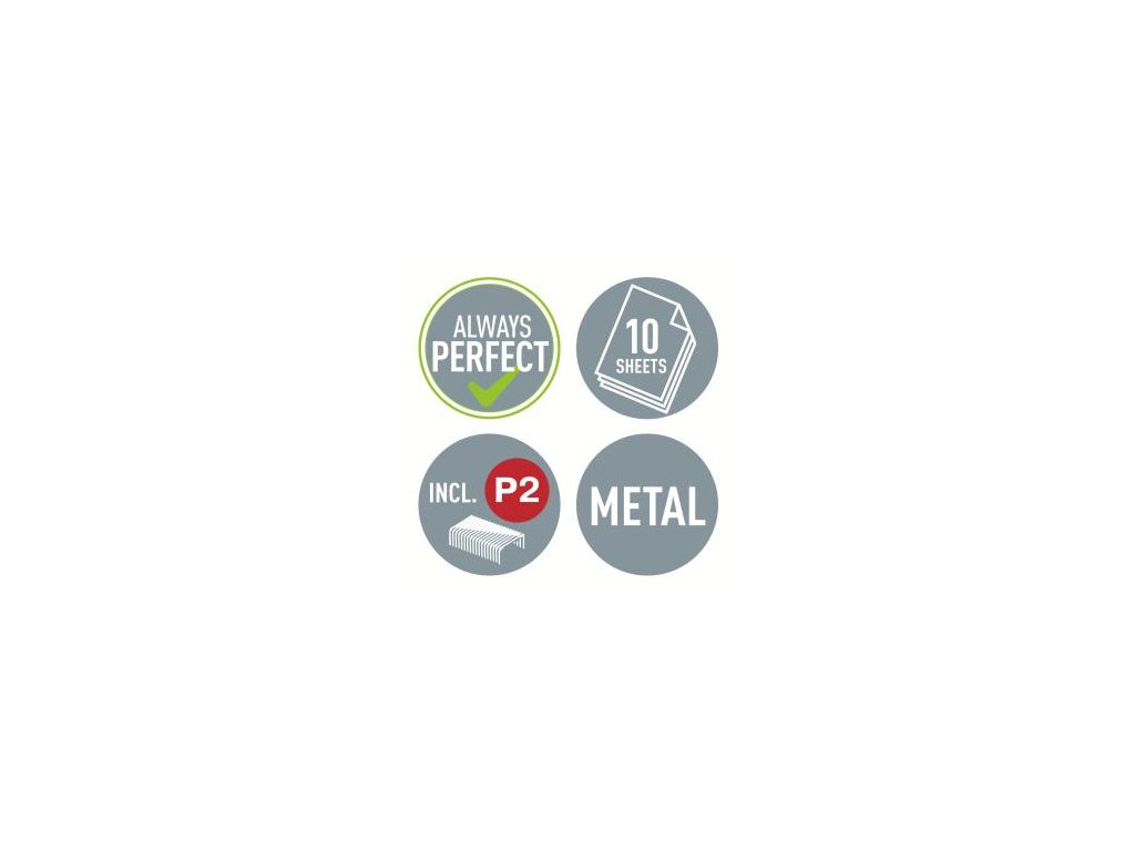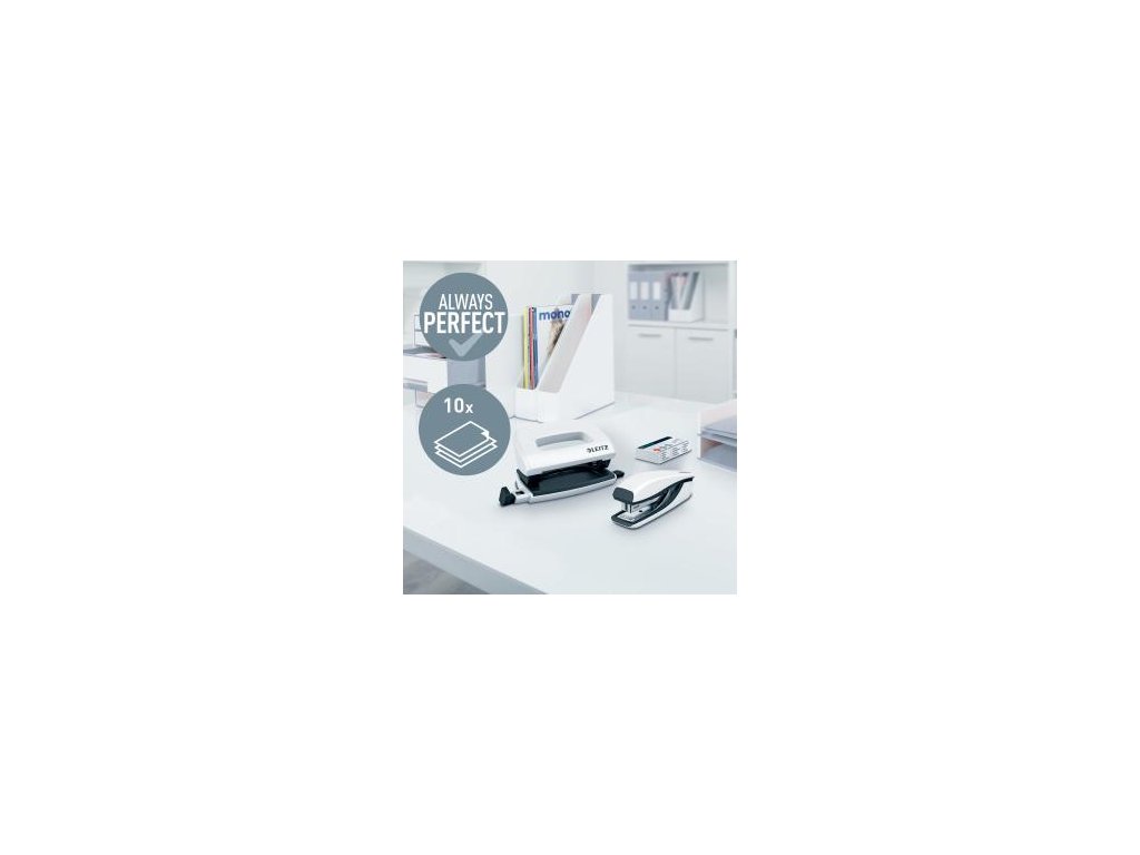 Malá zošívačka v moderných žiarivých farbách ideálna nielen do kancelárie, ale aj domov alebo na cesty. Vždy perfektné zošitie vďaka patentovanej technológii DIT. V kombinácii so spinkami Leitz Power Performance P2 (č. 10) dosiahnete vždy jednoduché a správne zošitie.Kapacita 10 hárkov. Vrecková zošívačka. Patentovaná technológia DIT na spoľahlivé zošívanie. Balenie v škatuľke, vrátane spiniek. Otvorením ramena o 180° je možné použiť nástenkové zošívanie (takrovanie). Farba biela.Dodatočné parametre