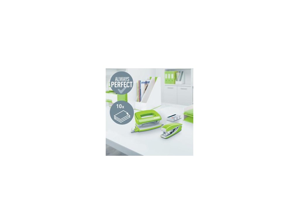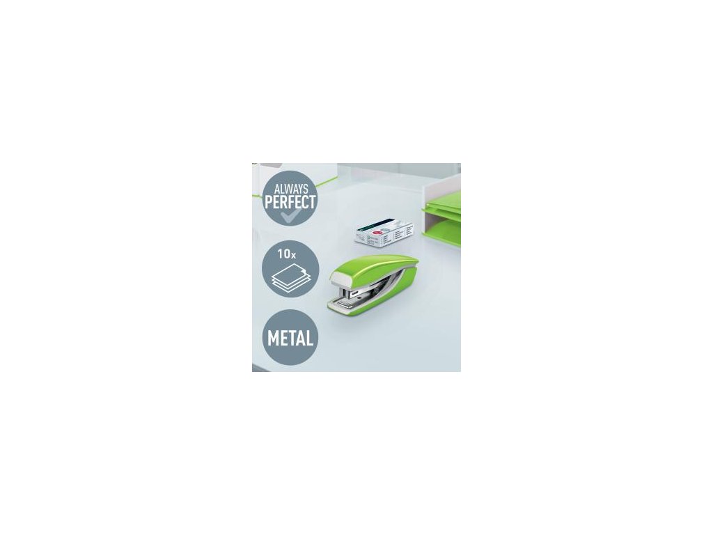 Malá zošívačka v moderných žiarivých farbách ideálna nielen do kancelárie, ale aj domov alebo na cesty. Vždy perfektné zošitie vďaka patentovanej technológii DIT. V kombinácii so spinkami Leitz Power Performance P2 (č. 10) dosiahnete vždy jednoduché a správne zošitie.Kapacita 10 hárkov. Vrecková zošívačka. Patentovaná technológia DIT na spoľahlivé zošívanie. Balenie v škatuľke, vrátane spiniek. Otvorením ramena o 180° je možné použiť nástenkové zošívanie (takrovanie). Farba zelená.Dodatočné parametre