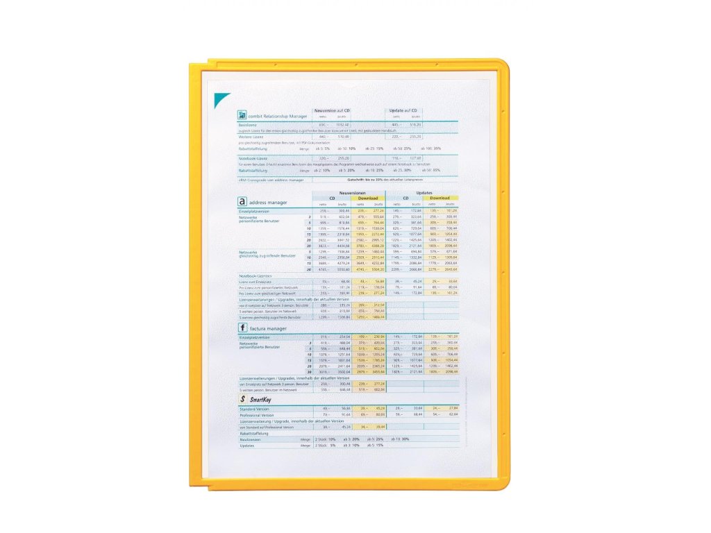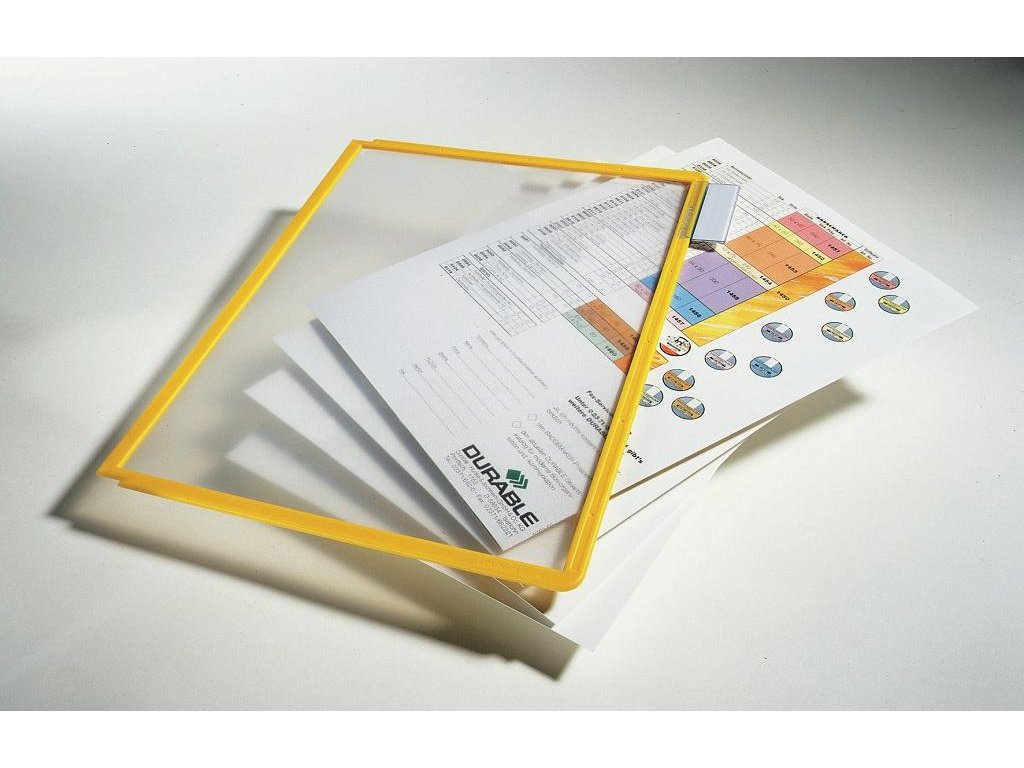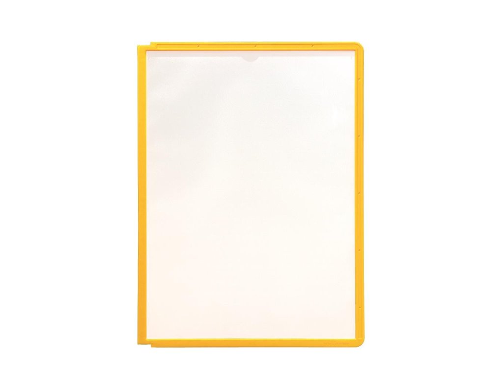 Displejový panel vyrobený z matného antireflexného polypropylénu pre systém Sherpa, kovové držiaky a rotačný stojan. Vložený materiál je kopírovateľný a skenovateľný. Pevný farebný rám s pozíciami pre indexy. Formát A4. Balenie 5 ks.Farba rámu: žltá