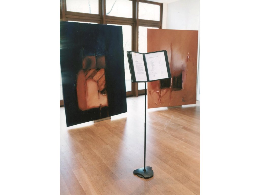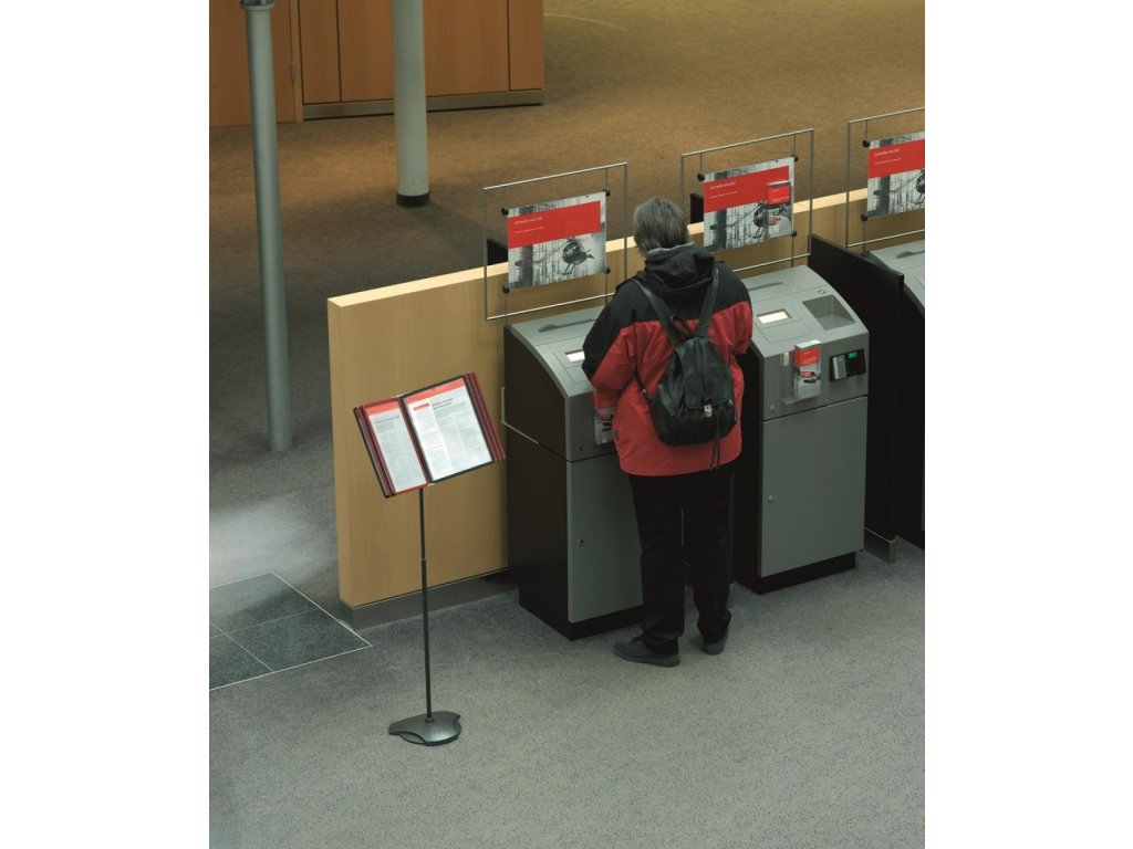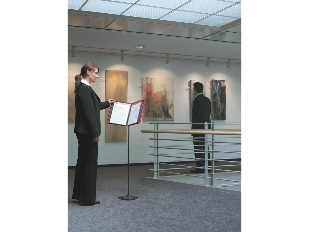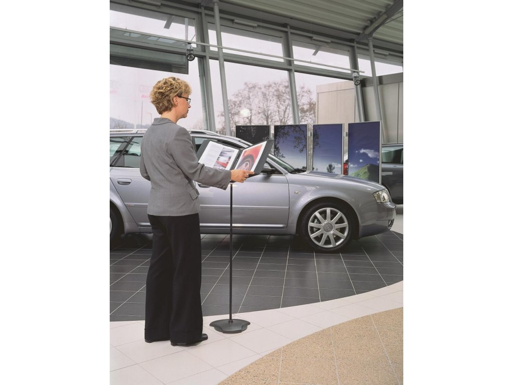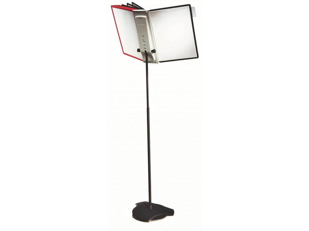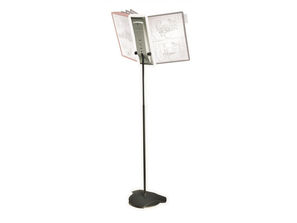 Podlahový statív na 10 panelov s pevným oceľovým podstavcom. Nastaviteľná výška 61 až 110 cm a uhol sklonu od 5 do 90 stupňov. Dodávaný bez katalógových panelov. Hmotnosť 4,9.kg. Farba antracitová/siváKapacita panelov: 10