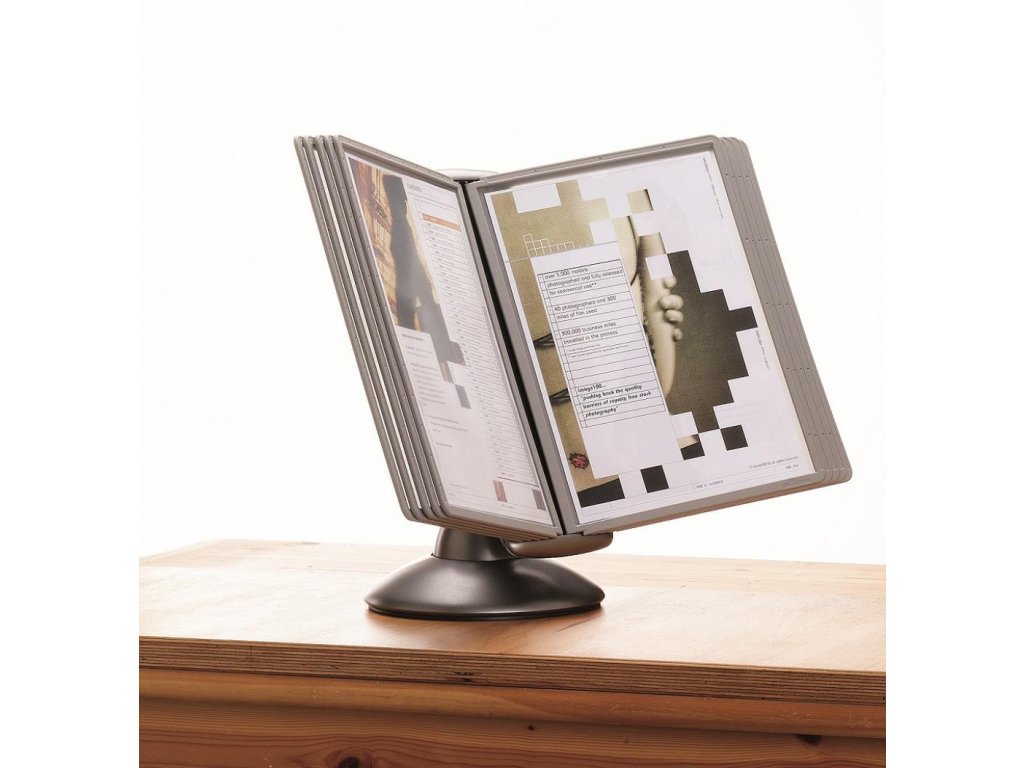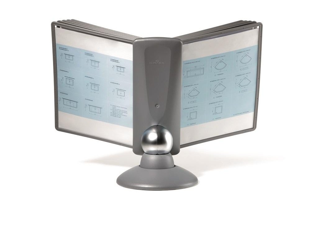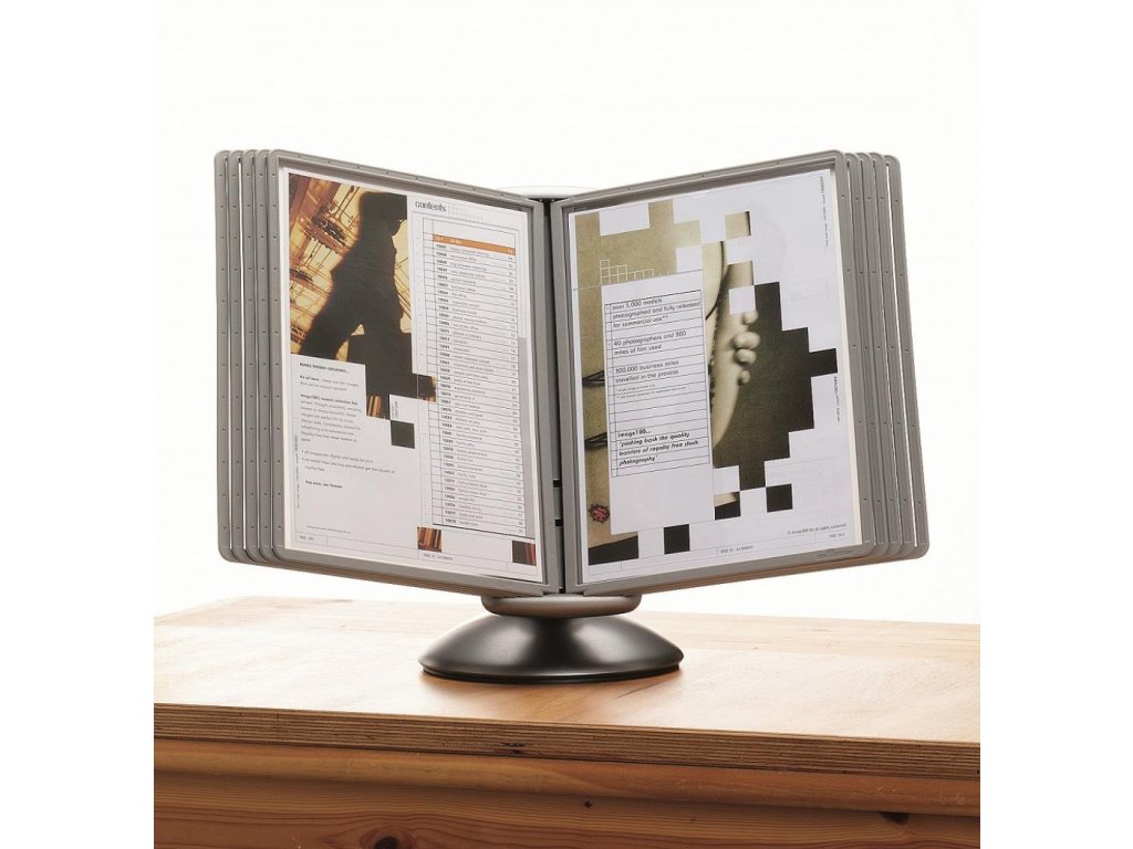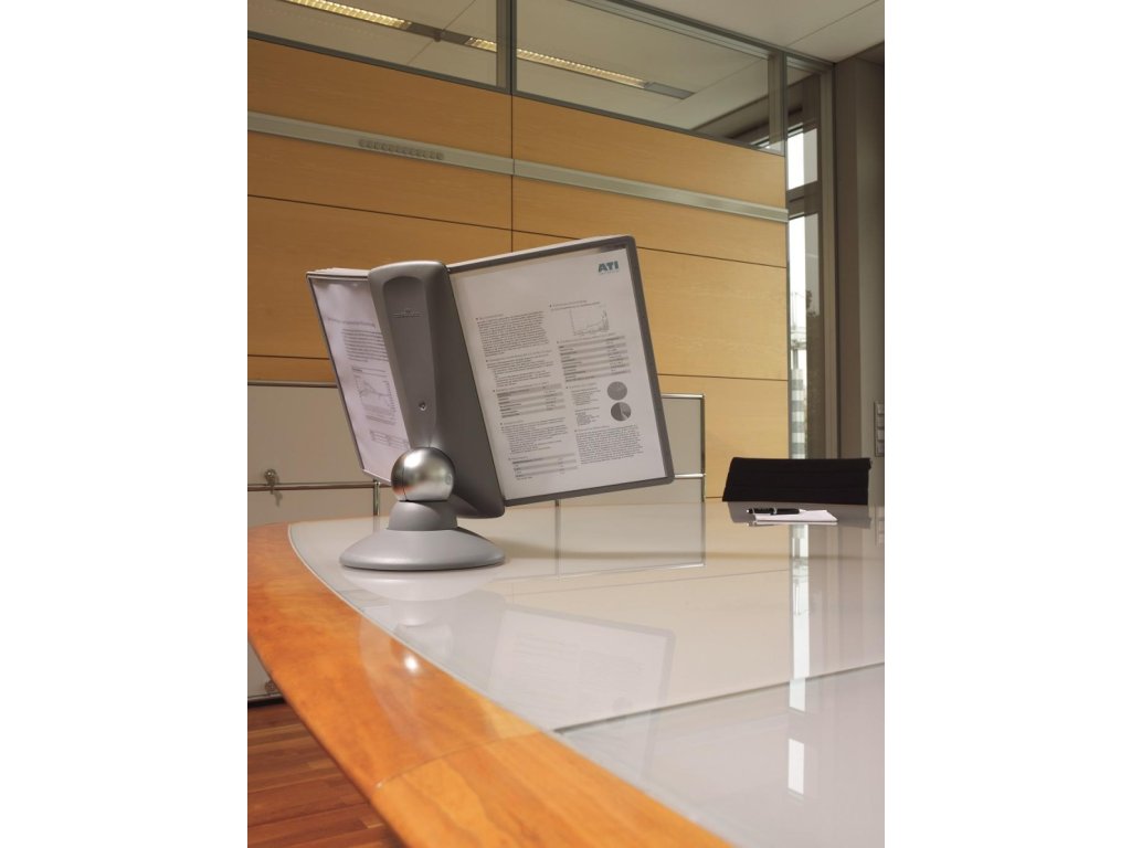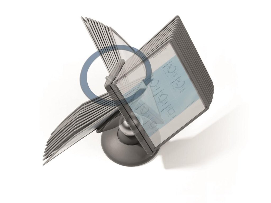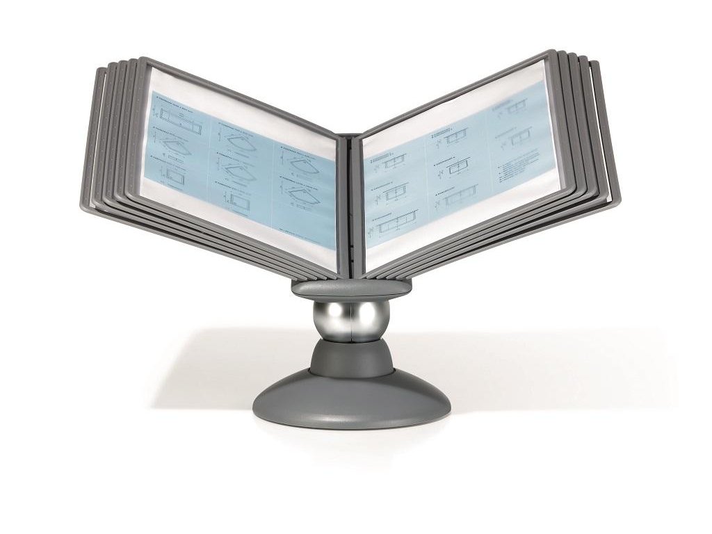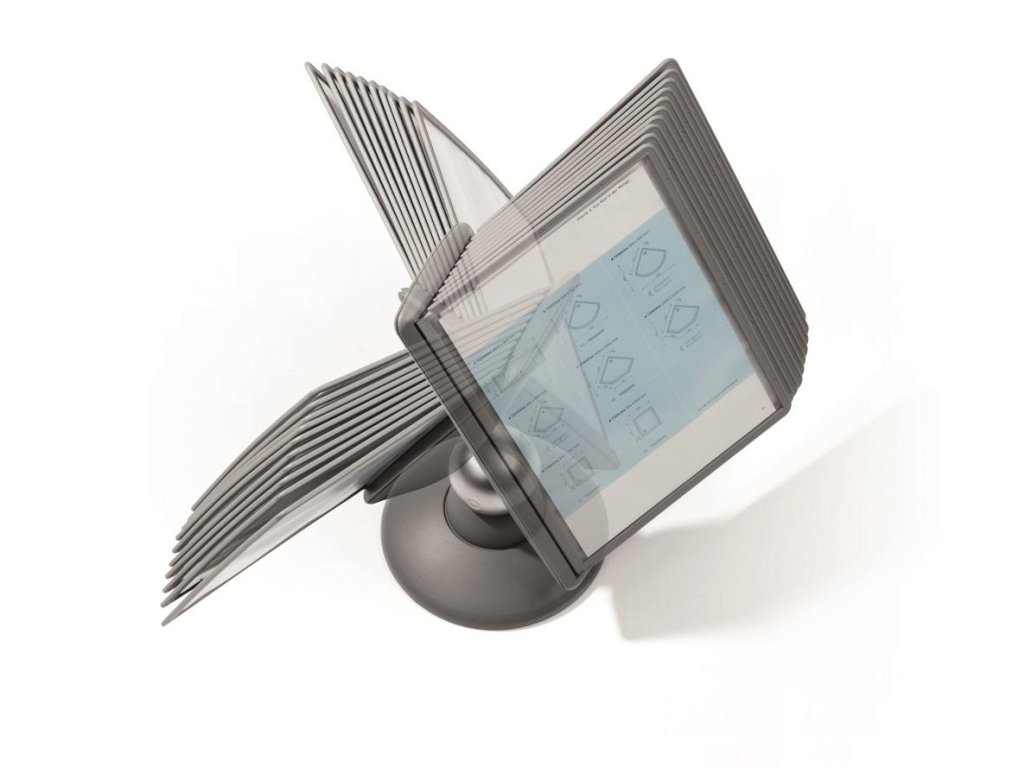 Unikátny dizajn spojený s kreatívnosťou a funkčnosťou stojana na stôl. Guľový kĺb zabezpečuje bezproblémové otáčanie panelov o 360 °, nastaviteľný uhol na čítanie medzi 25 ° a 70 °. Je dodávaný s 10 panelmi. Farba: kĺb lesklá grafitová, držiak a panely matná grafitová.Kapacita panelov: 10