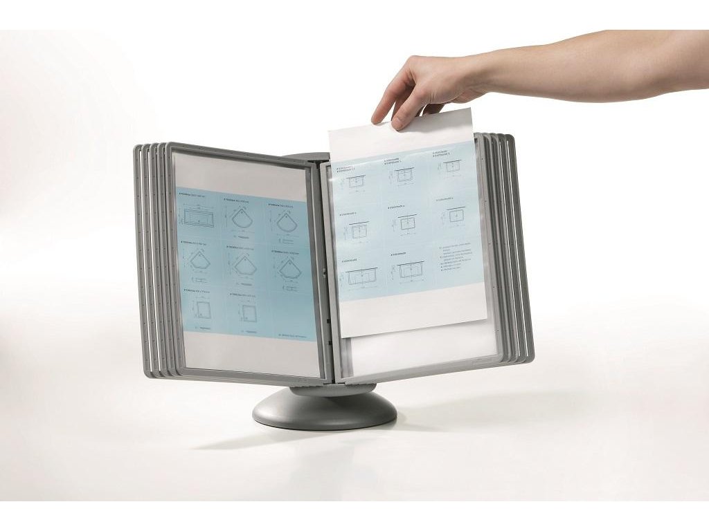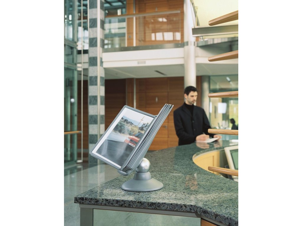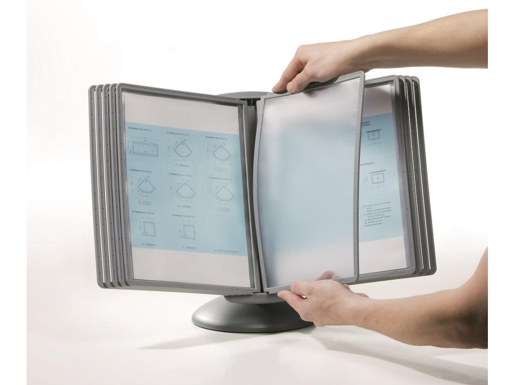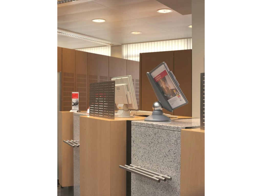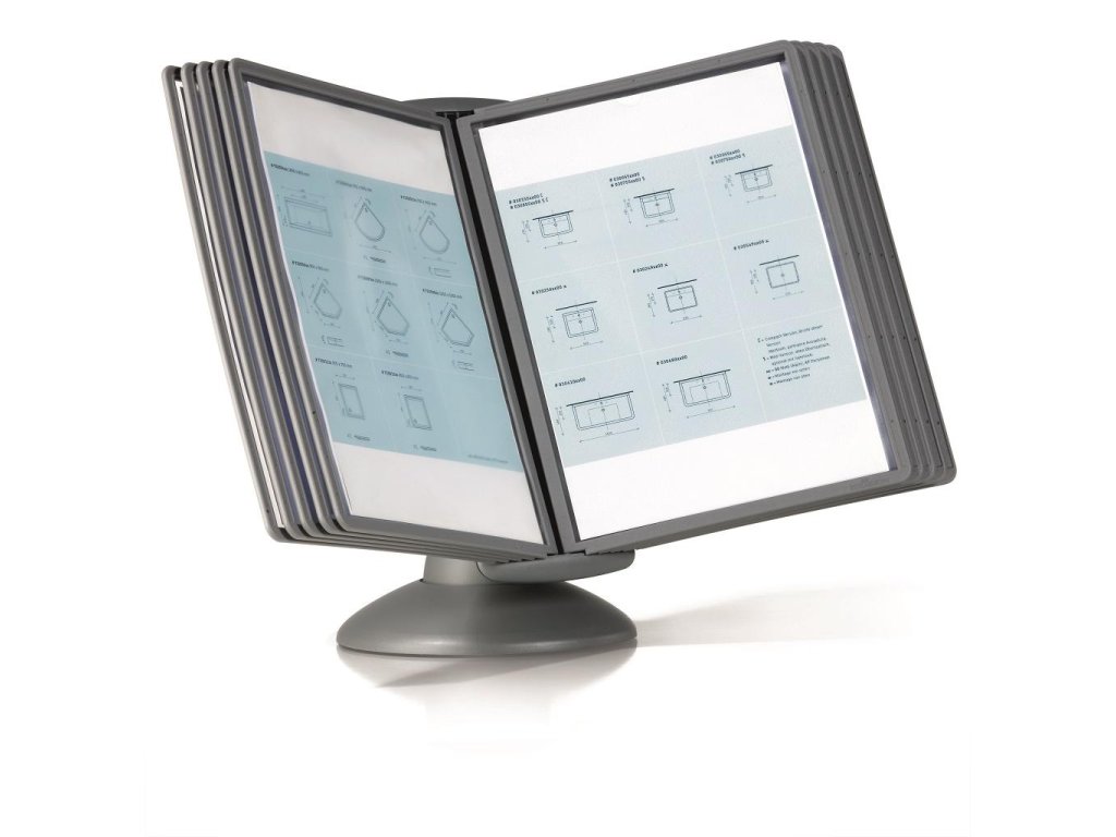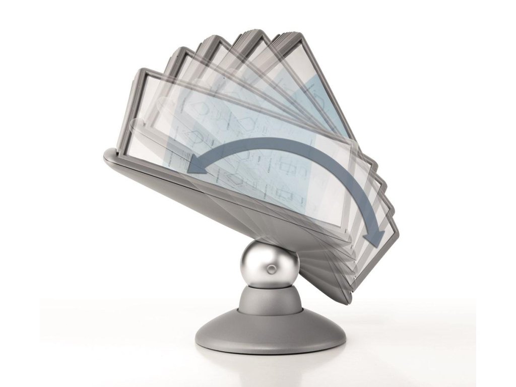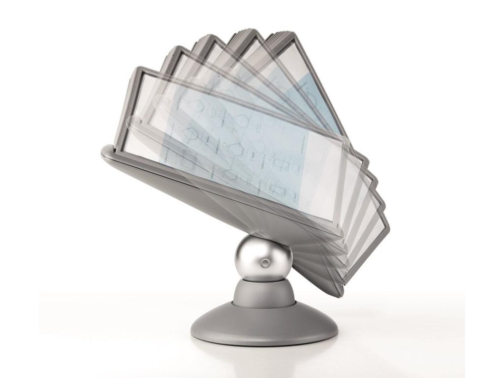 Unikátny dizajn spojený s kreatívnosťou a funkčnosťou stojana na stôl. Guľový kĺb zabezpečuje bezproblémové otáčanie panelov o 360 °, nastaviteľný uhol na čítanie medzi 25 ° a 70 °. Je dodávaný s 10 panelmi. Farba: kĺb lesklá grafitová, držiak a panely matná grafitová.Kapacita panelov: 10