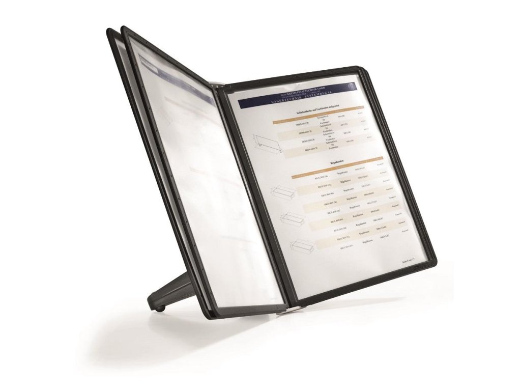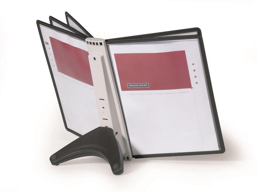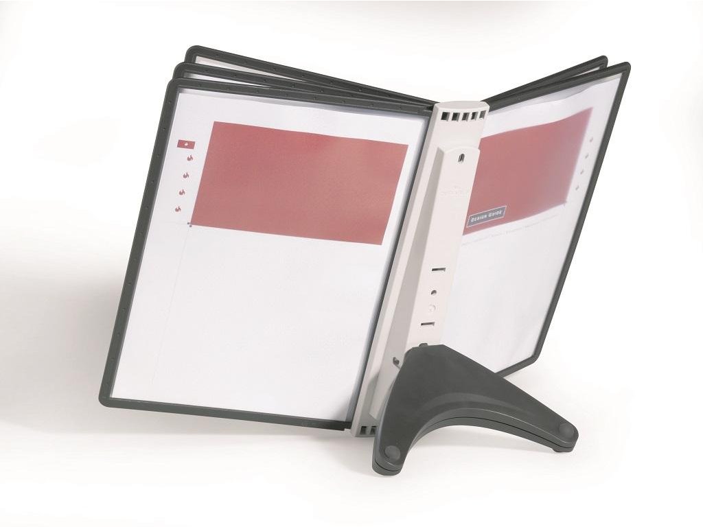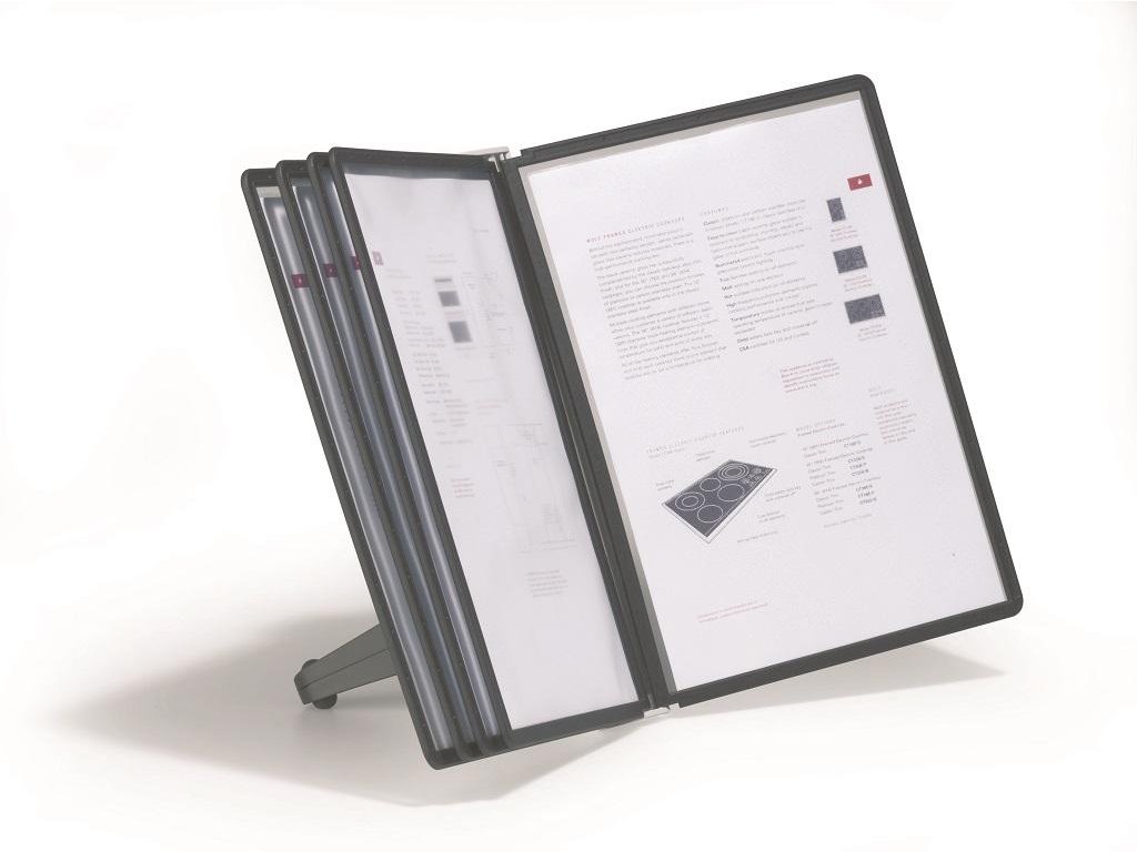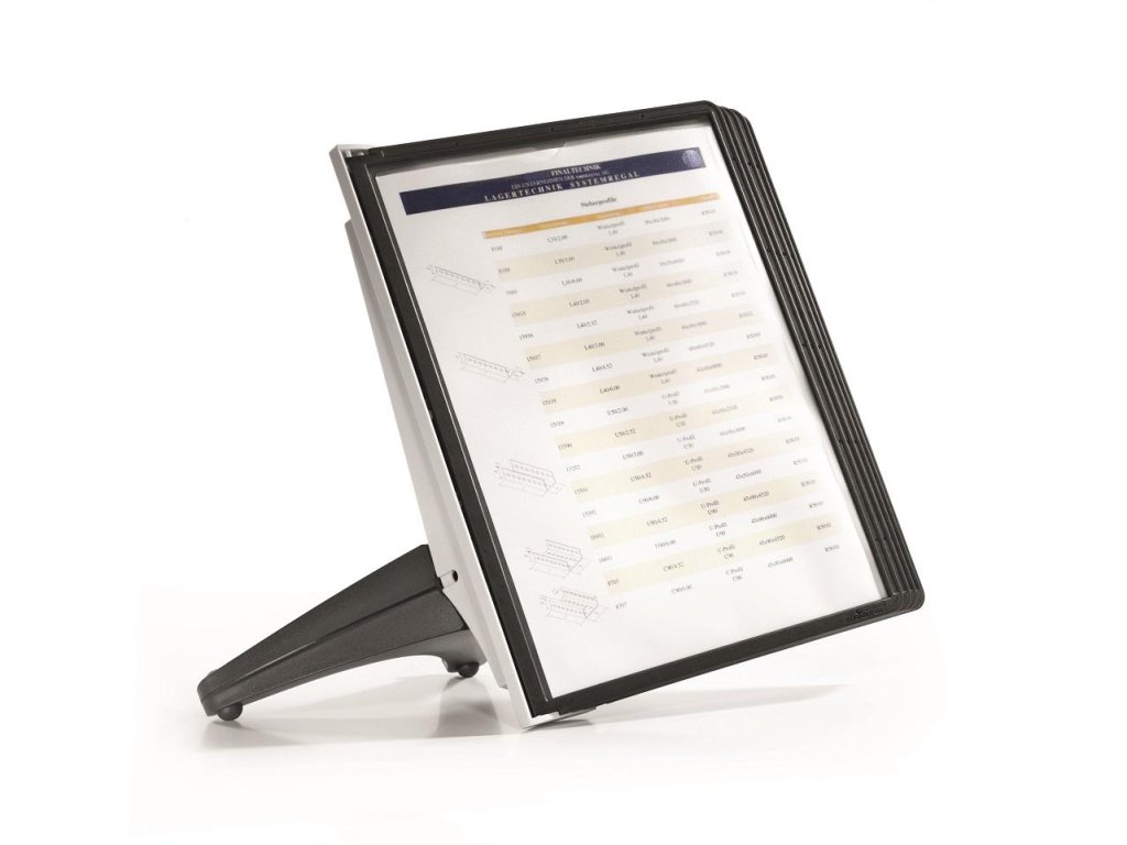 Stojan na stôl s 5 polypropylénovými displejovými panelmi formátu A4 do malých kancelárií. Stabilná základňa, systém ideálny pre užívateľov, ktorí sú obmedzení nedostatkom miesta. Farba základne i panelových rámčekov čierna.Kapacita panelov: 5
