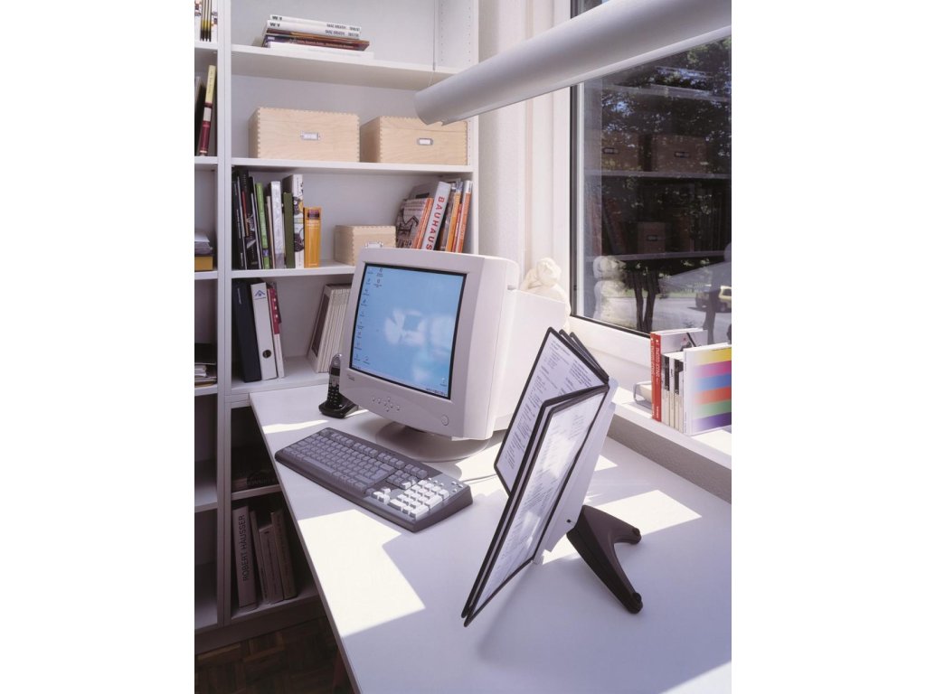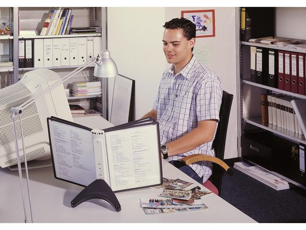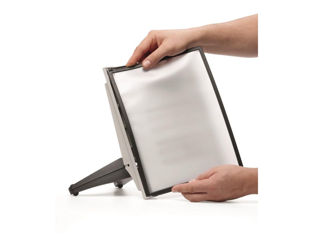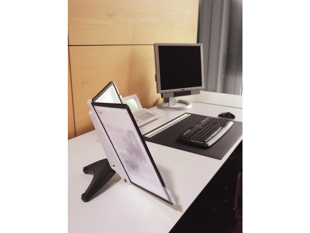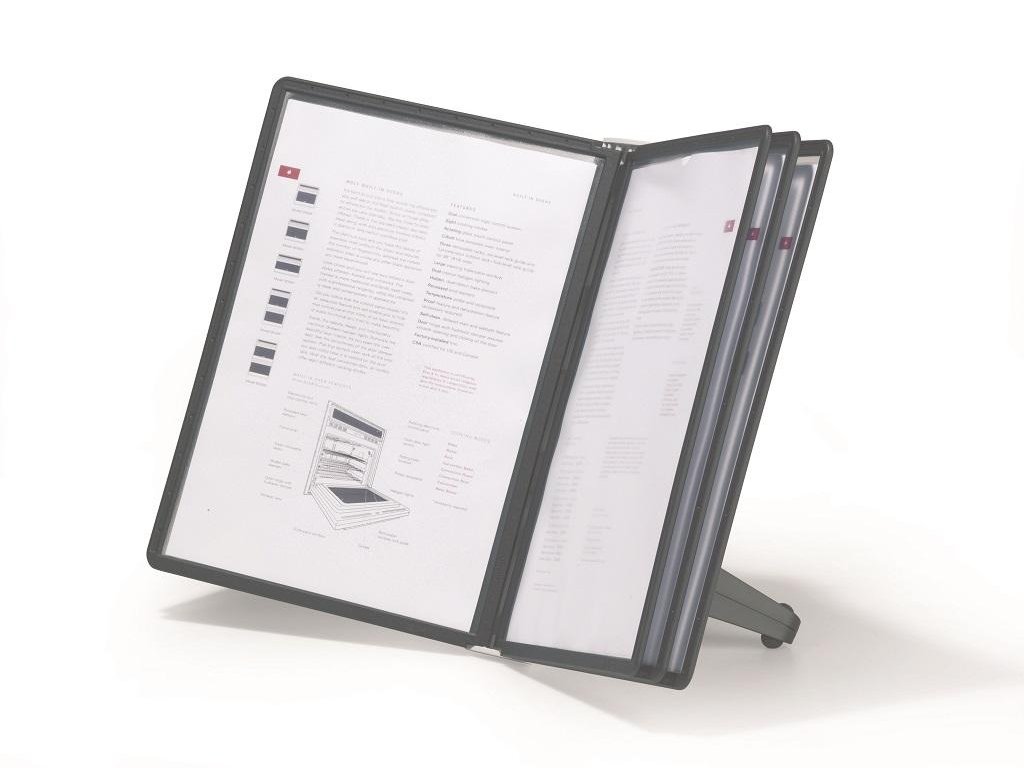Stojan na stôl s 5 polypropylénovými displejovými panelmi formátu A4 do malých kancelárií. Stabilná základňa, systém ideálny pre užívateľov, ktorí sú obmedzení nedostatkom miesta. Farba základne i panelových rámčekov čierna.Kapacita panelov: 5