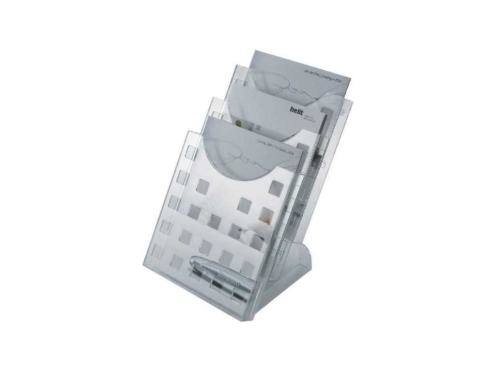 Sada odkladačov na prospekty pozostáva z troch univerzálnych odkladačov formátu A4 a stojana.Farba: priehľadná číra