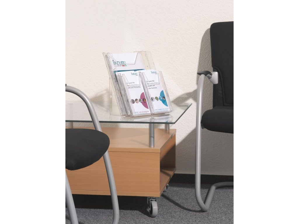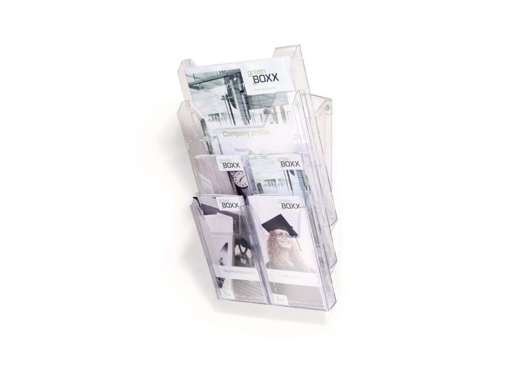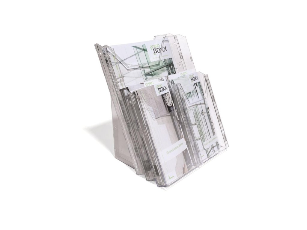 Kombinovaný stojan COMBIBOXX A4 s odkladačom A4 vnútorných rozmerov 240 × 311 mm a štyroch odkladačov 1/ 3 A4 (DL alebo A6) s hĺbkou 24 mm. Možnosť aplikácie na stenu alebo stôl. Materiál priehľadný plast.Dodatočné parametre