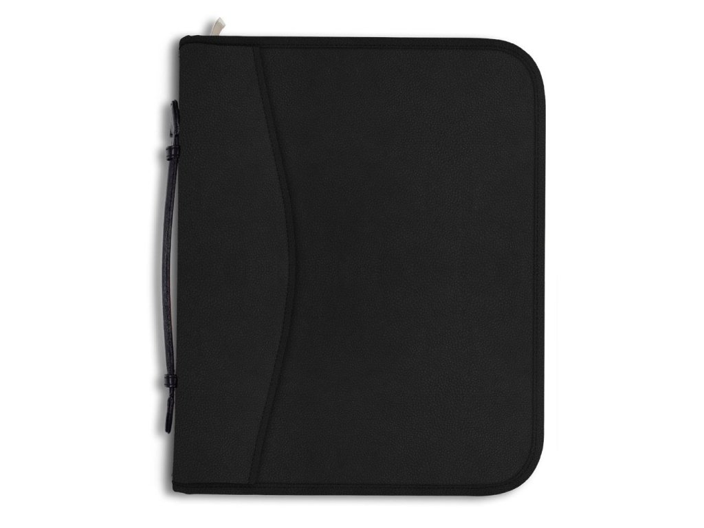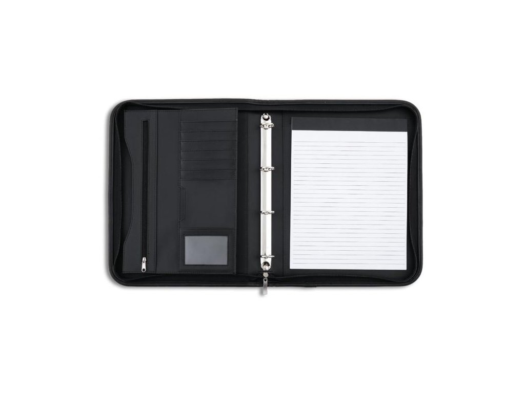 Konferenčná mapa so zipsom a rukoväťou na prenášanie, vybavená 4-krúžkovou mechanikou, vreckami niekoľkých veľkostí. V prevedení imitácie kože, úprava matná. Šírka chrbta 47 mm.Farba: čierna