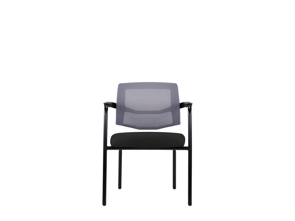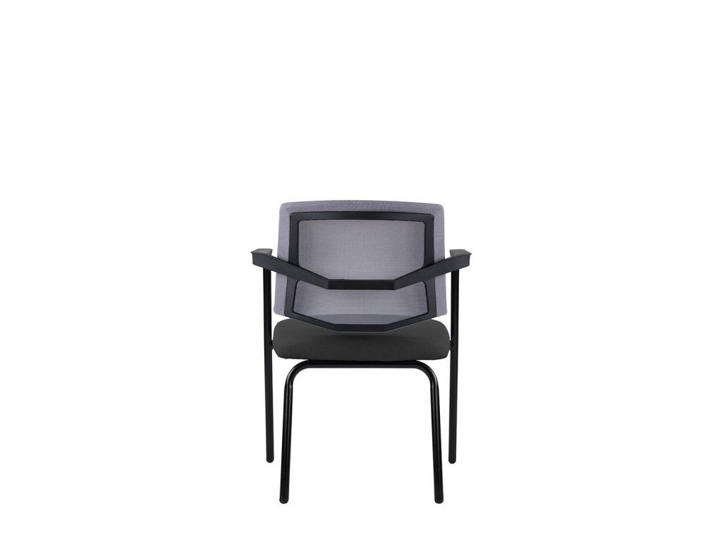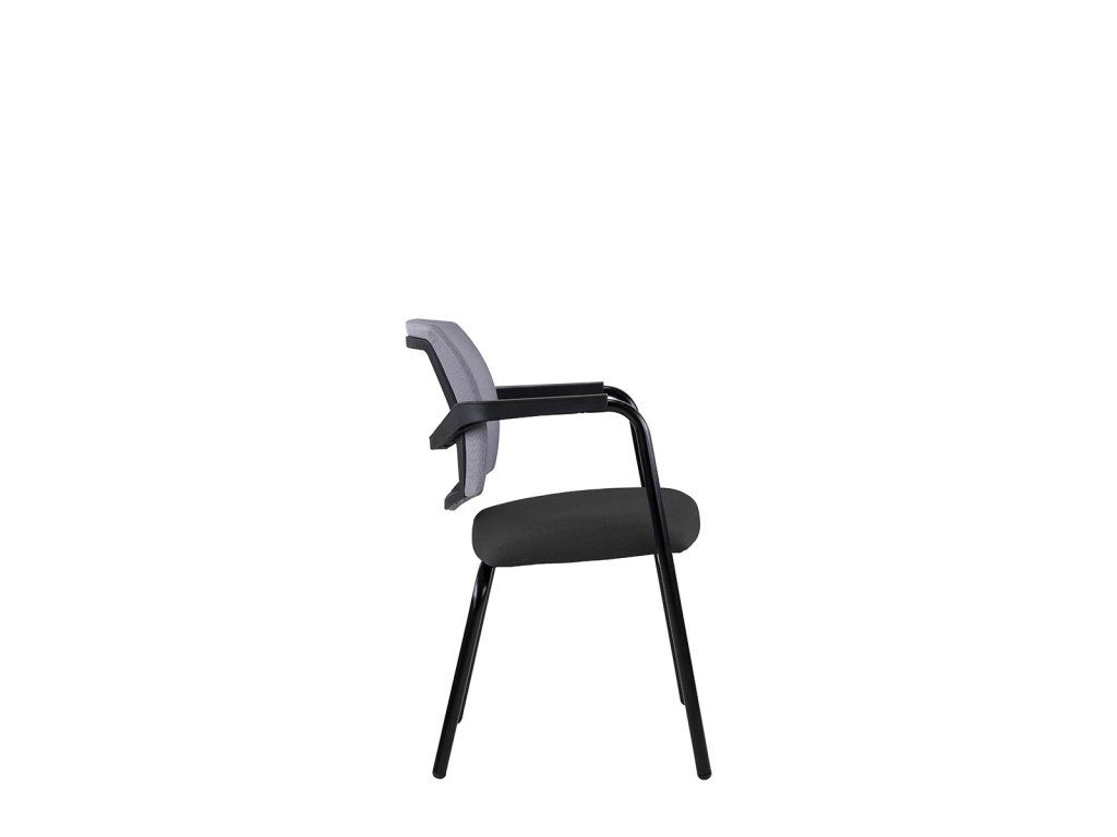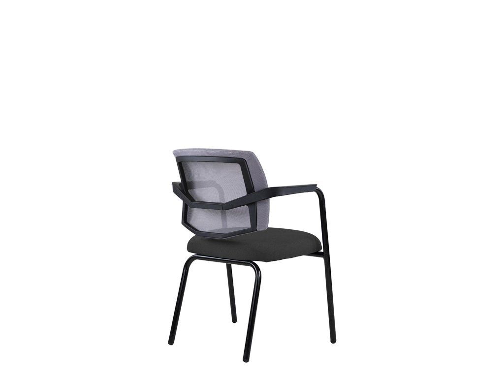 Moderná konferenčná stolička so štvornohou podnožou, čalúneným sedákoma sieťovinou na operadle.