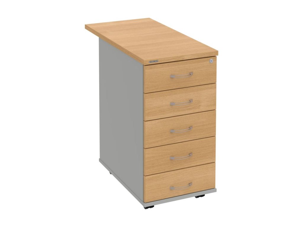 Kontajnery - všetko uložené a vždy poruke. Kontajnery sa väčšinou umiestňujú pod stoly. Mobilné modely sú vybavené kolieskami, je možné ich premiestniť podľa potreby. Základným materiálom korpusov je kvalitná laminovaná drevotriesková doska hrúbky 18 mm. Pre dlhšiu životnosť je na horný diel korpusu použitá doska, ktorej hrúbka je 25 mm. Korpusy a čelá zásuviek sú chránené proti poškodeniu hranou ABS 2 mm. Horná doska ma hĺbku 80 cm. Kontajnery sú vybavené zámkom s centrálnym zamykaním. Vďaka integrovanému systému STOP-CONTROL s centrálnym zámkom u väčšiny kontajnerov sa nemusíte báť prevrhnutiu kontajnera alebo prípadného privretia ruky. Systém zaručí, že pri otvorení jednej zásuvky sa ostatné zásuvky automaticky zablokujú. Zásuvky sú z plastu, ktorý je ľahko umývateľný a vhodný pre jednoduchú údržbu. Praktickou súčasťou vrchnej zásuvky je prehľadný organizér a priestorové deliace priečky. Vaše ceruzky, sponky a ďalšie kancelárske potreby budú vždy na poriadku. Organizér a deliace priečky sú súčasťou každého kontajnera. Na kontajnery Hobis sa vzťahuje päťročná záruka.