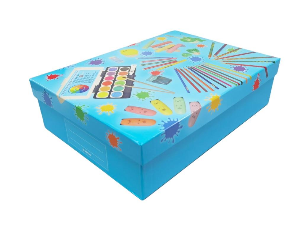 Perfektne navrhnutý box na uskladnenie a organizáciu výtvarných a školských potrieb. Bez problémov sa doň zmestí výkresový blok formátu A4, zošit či zápisník. Vyrobený z pevného kartónu, potiahnutý papierom s lesklým povrchom a praktickou plochou na popis, pevné veko. Rozmery: veko: 33,5 × 24 × 3 cm, box: 33 × 23,5 × 9 cm.Dodatočné parametre