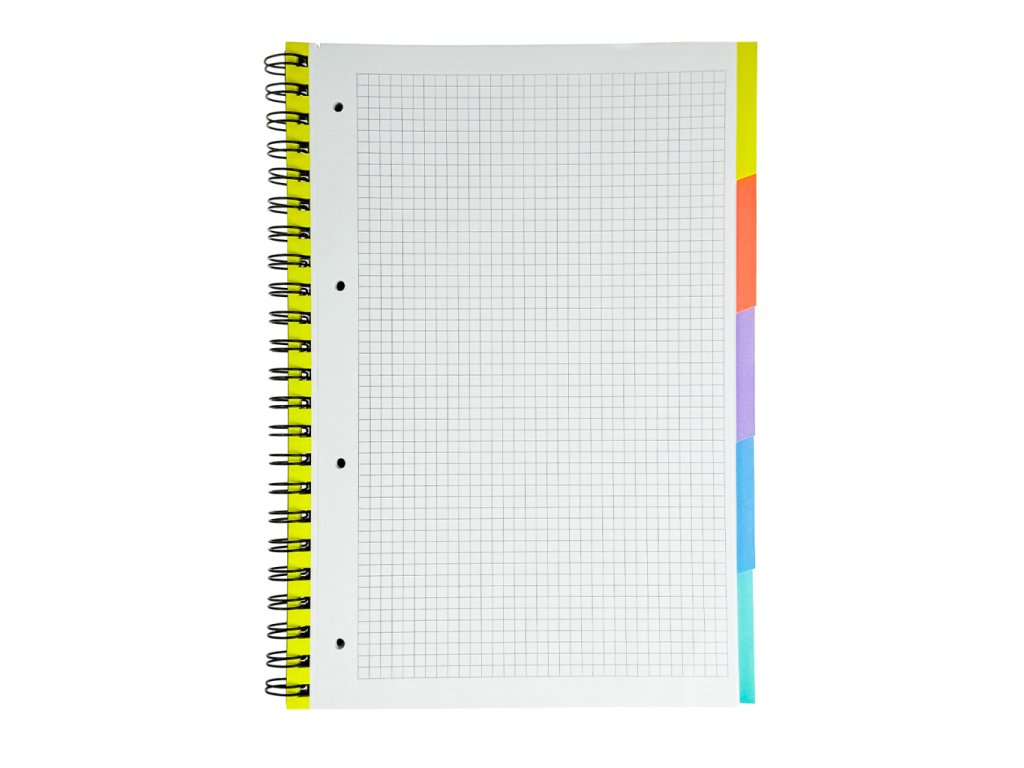 Blok formátu A4 s farebným registrom, mikro perforáciou a kovovou bočnou špirálou, vyrobený z kvalitného bieleho ekologického papiera 70 g / m2. 5-farebná registrácia na pravom okraji bloku. Každá farba registra obsahuje 20 listov papiera. Vonkajšia krycia fólia odpudzuje nečistoty a kvapaliny, pevný kartónový podklad.Úprava: štvorčeková
