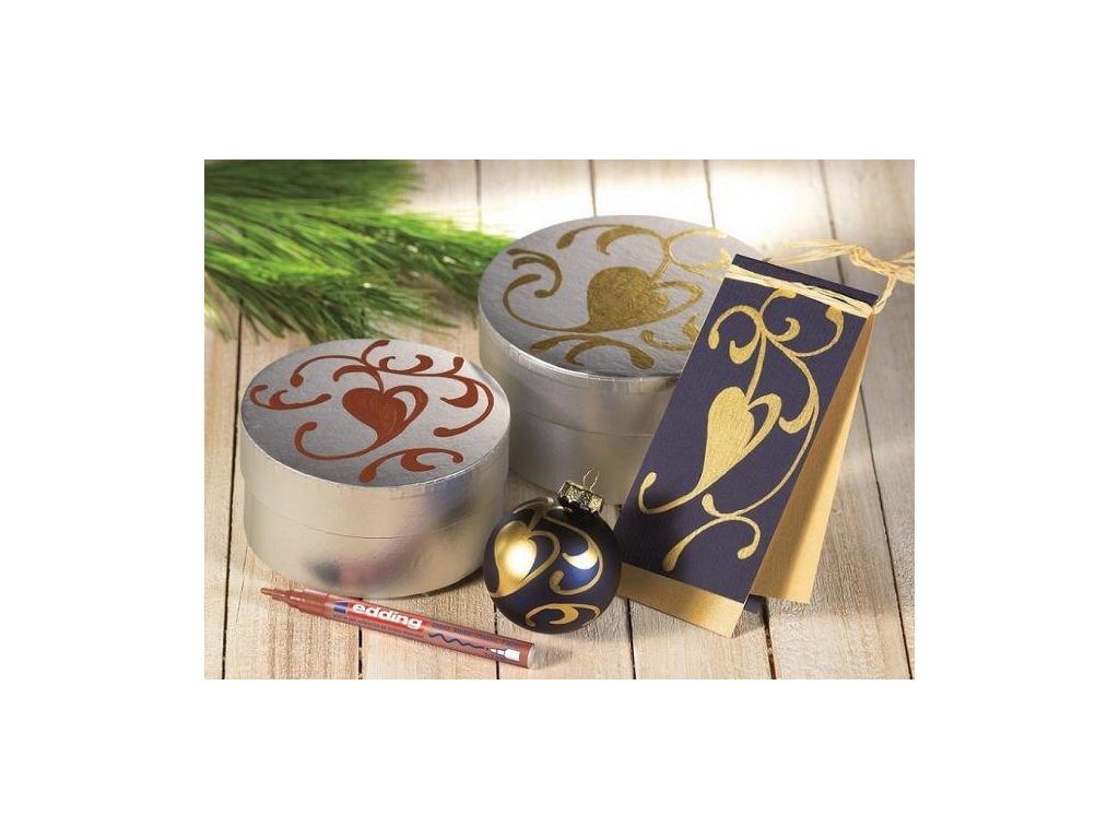 Lakový popisovač s hliníkovým obalom, vhodný pre vodovzdorné písanie, značkovanie a kreslenie na takmer všetky materiály. Nearomatický pigmentový atrament bez prísad toluénu/ xylénu rýchlo schne a vytvára úplne krycí lakovaný povrch, vhodný aj pre tmavé a priehľadné povrchy. Vysoká stálosť na svetle, nezmazateľnosť a odolnosť voči ohňu. Prietok atramentu riadený ventilom. Hrot okrúhly, šírka stopy 2 - 4 mm. Väčšie balenie 10 ks.Farba: medená.