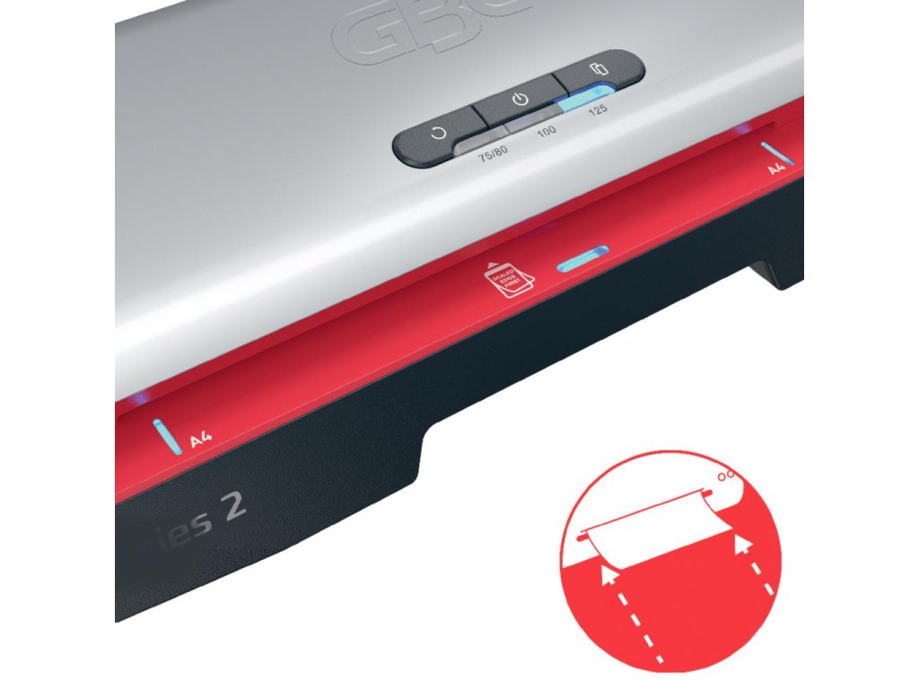 • systém SMART LED poskytuje zreteľné vizuálne a zvukové signály: červené svetlo signalizuje zahrievanie, zatiaľ čo modré svetlo so zvukovým signálom signalizuje pripravenosť na laminovanie